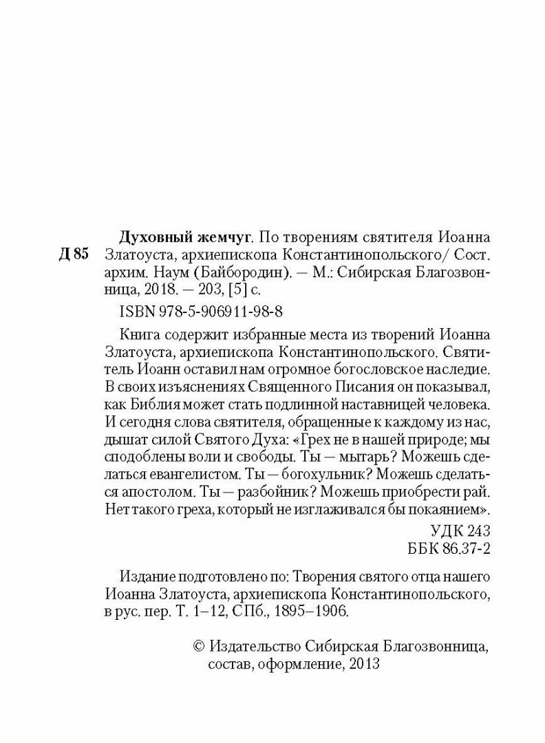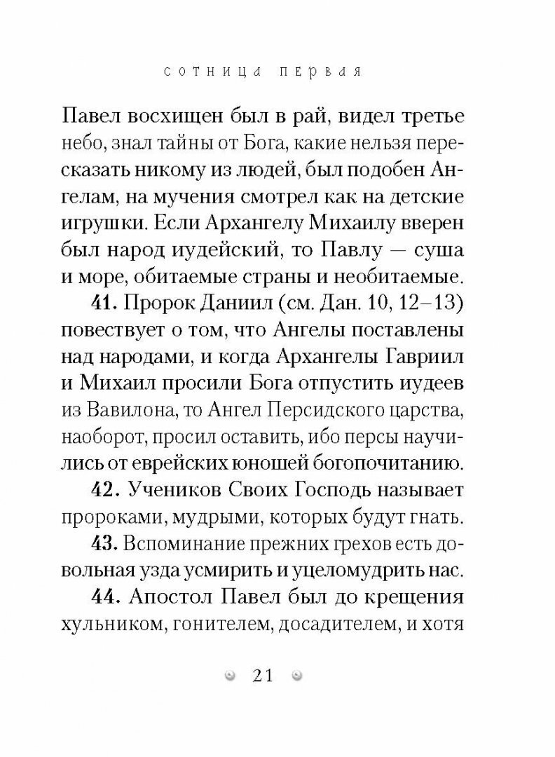 Ее можно перечитывать бесконечно и постоянно черпать силу слова духовной мысли. Читая ее, можно не только избавиться от душевной тяжести, но и найти опору в сомнениях, принять правильное решение. Эта книга - еще одно напоминание нам всем, что надо чаще читать книги святых, которые являются нашими небесными родственниками и помогают обрести великую радость и смысл земной жизни. Спасибо издательству «Сибирская Благозвонница» за интересную и очень красивую книжечку духовной мудрости. Книга сделана с большой любовью и на все времена.