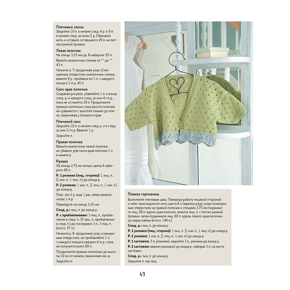 Эта книга познакомит вас с искусством вязания ажурных узоров на спицах. В начале книги автор приводит подробное описание пряжи, необходимых для вязания принадлежностей и рассматривает элементарные приемы: набор и закрытие петель, лицевые и изнаночные петли, идеальные швы и финальную обработку каждого изделия. Само ажурное вязание в книге поделено на четыре урока: узоры с отверстиями, ажурные полосы, ажурное полотно и ажурная кайма. Каждый урок включает подробное описание техники вязания в простом формате, где инструкции дополнены пошаговыми фотографиями. За техниками следует подборка красивых узоров, выполненных в нежной пастельной гамме. В конце каждого урока представлена подборка из простых, стильных проектов, в которых применяются избранные узоры. Модели полностью или почти полностью обходятся без убавлений и прибавлений петель, чтобы облегчить работу новичкам. Не бойтесь попробовать свои силы в ажурном вязании!
