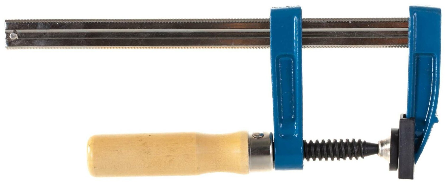 Универсальная F-образная струбцина для фиксации деталей при сборке и их сжатия при склеивании. Имеет прямую профилированную направляющую с насечками из прочной высоколегированной стали и кованные насадные упоры захвата. Винтовой прижим с износостойкой резьбой трапециевидного профиля.