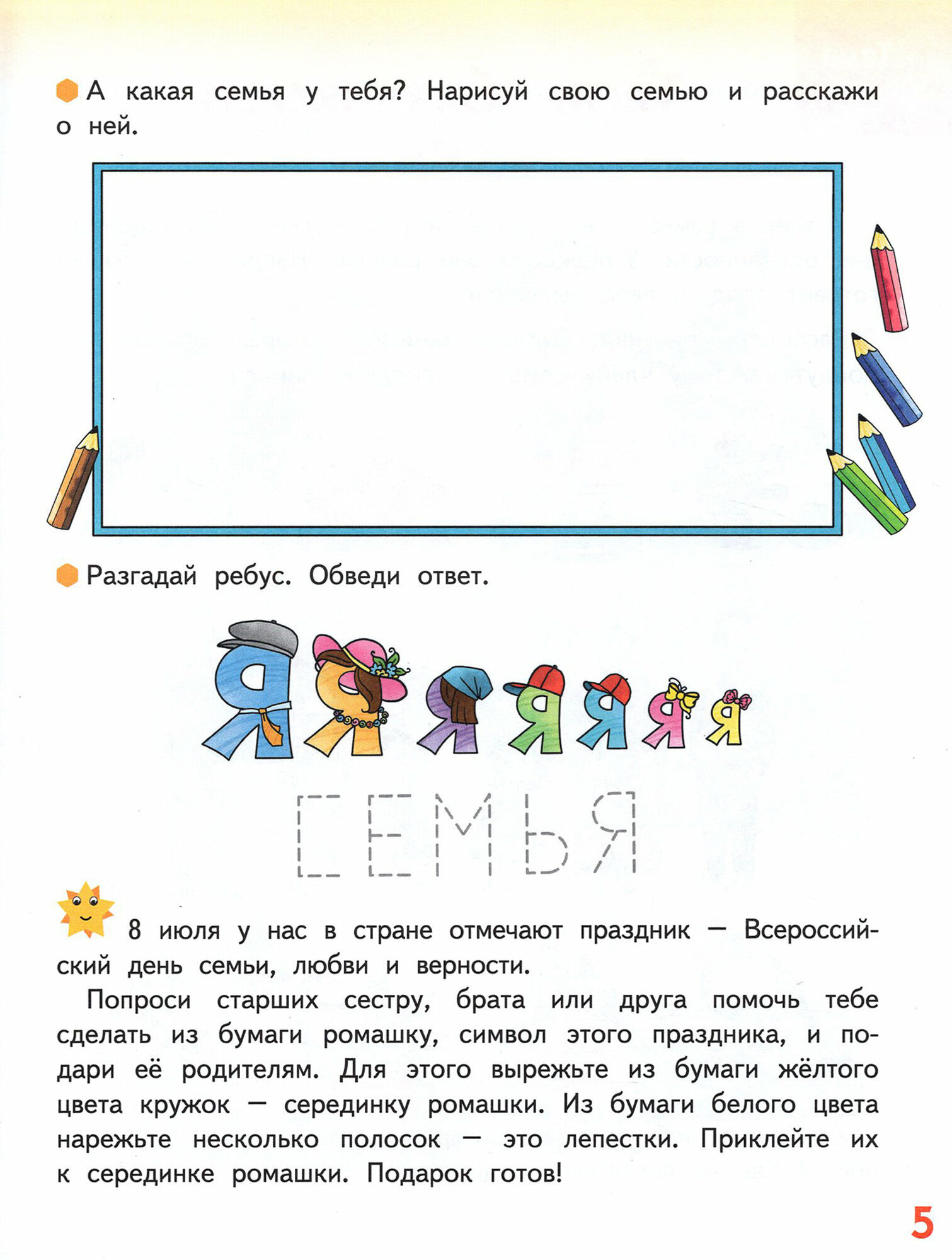 Занимаясь по тетради, ребёнок поймёт, что такое семья, для чего она создаётся, кого называют членами семьи. Представленные задания помогут дошкольнику осознать значимость семейных отношений, привить уважение к старшим членам семьи, закрепить понятие о семейных традициях и реликвиях, правилах этикета.