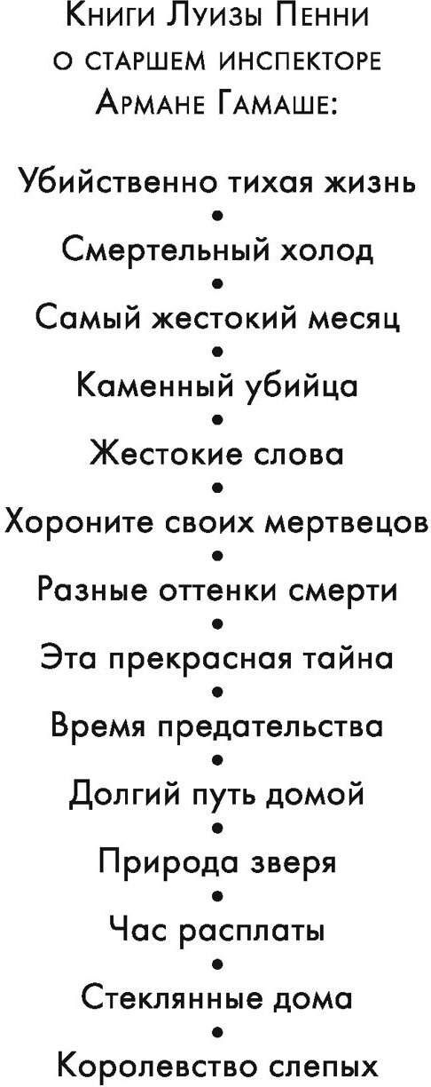 Книга понравилась, прочла за пару дней - затянуло. Правда, больше подойдёт тем, кто читал хотя бы некоторые предыдущие книги (это серия), - атмосфера и образы персонажей создавались в более ранних книгах. В меньшей степени это классический детектив с жертвой убийства (хотя их там даже две), скорее, это логическое завершение сюжетной линии центрального персонажа, старшего инспектора Гамаша, - давнего служебного расследования. Убийство и затеяно автором дабы завлечь героя в деревню, а заодно и украсить художественную составляющую произведения. Всё получилось. Но, насколько мне известно, есть и следующие книги - значит не всё ещё закончилось? ;-)