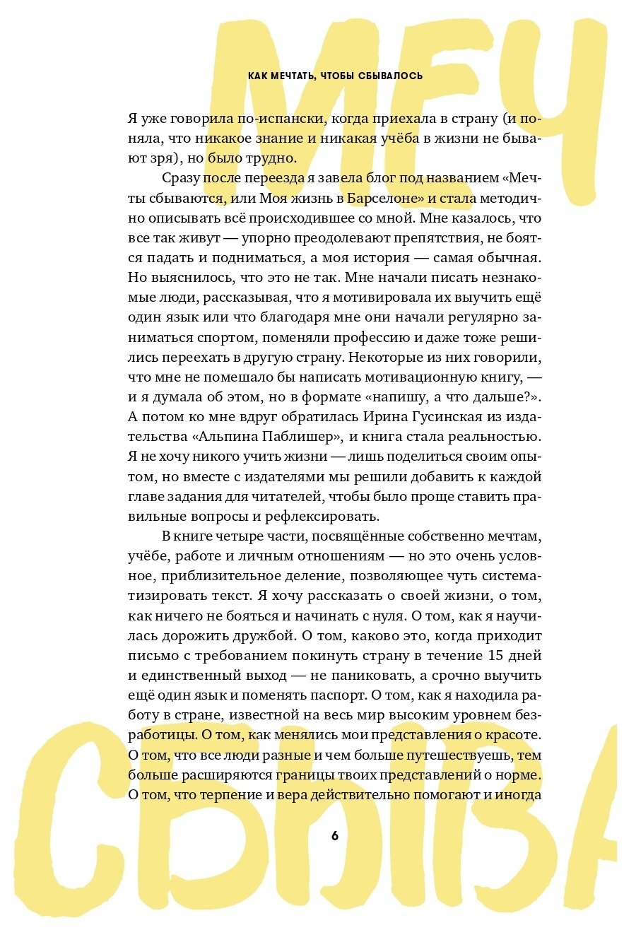 Большинство желаний, начавшись с мысли "вот бы мне когда-нибудь…", так и остаются фантазиями. Нам мешают собственные страхи и сомнения в том, что все получится. Мы зависим от стереотипов и мнения окружающих. В этой книге Ольга Лукинская, автор популярного блога "Мечты сбываются, или Моя жизнь в Барселоне", на примерах из своей жизни рассказывает, как преодолевать трудности, не бояться начать все с нуля и, главное, - как мечтать, чтобы сбывалось. Вы найдете советы и задания, которые помогут вам понять, чего вы хотите, оценить свои возможности и подготовить конкретный план по достижению желаемого. Такого рационального подхода автор книги придерживается во всем, будь то работа, учеба или личные отношения. Ее вдохновляющее руководство о том, как превратить мечты в реальность, - неоценимая помощь каждому, кто хочет изменить свою жизнь.