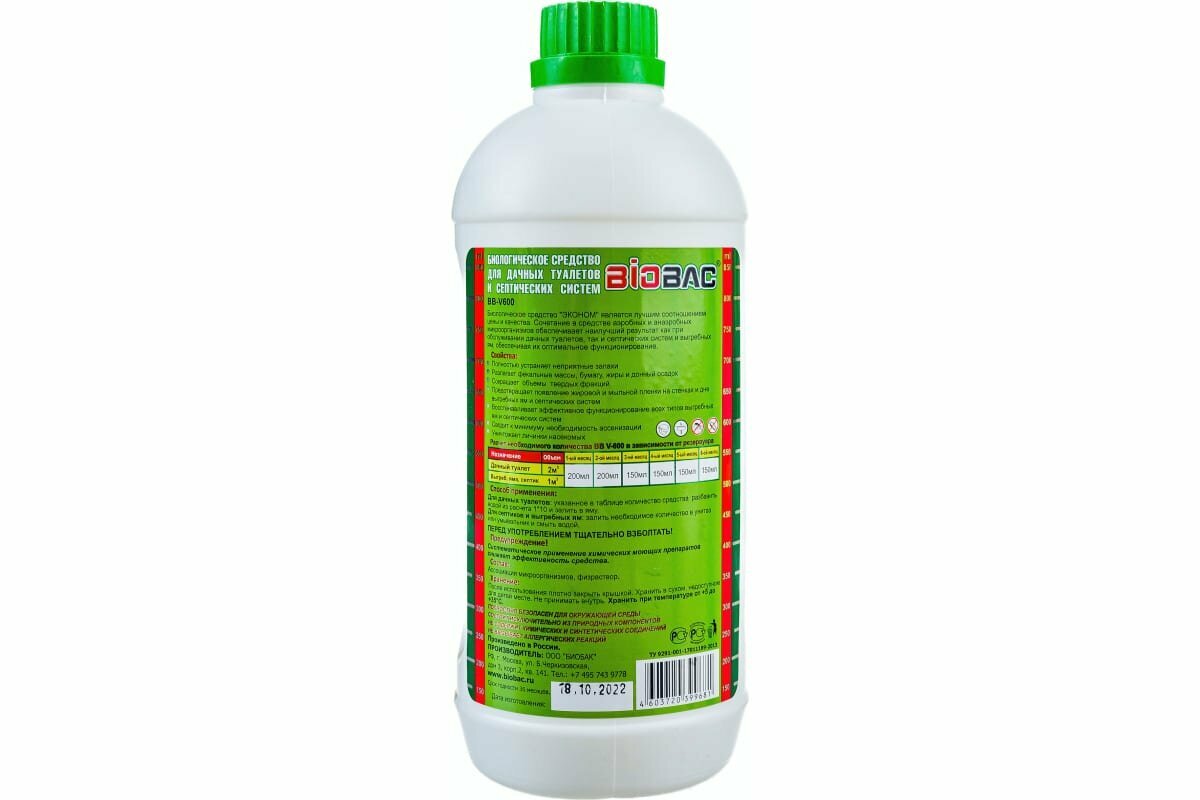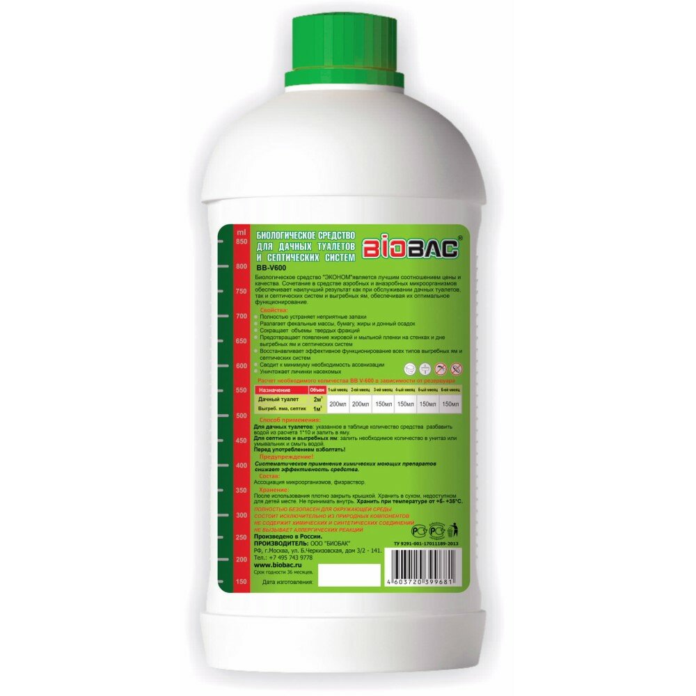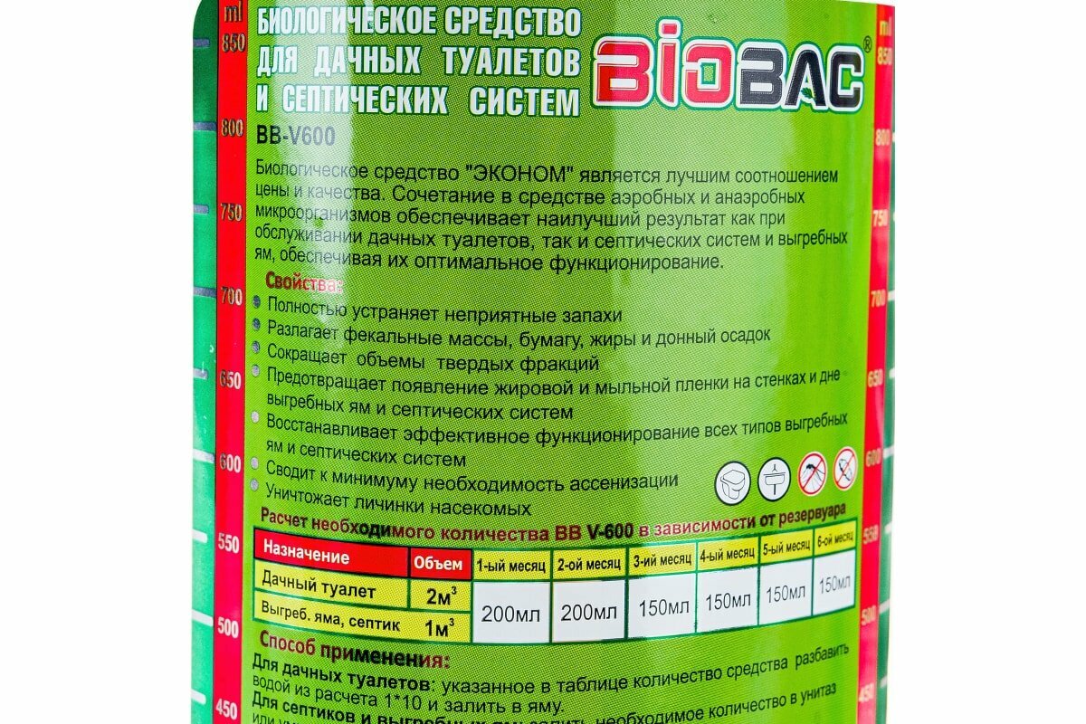 Биологическое средство для дачных туалетов и септических систем ЭКОНОМ Биобак сочетает в себе комплекс аэробных и анаэробных бактерий BIOBAC обеспечивает наилучший результат как при обслуживании дачных туалетов, так и септических систем и выгребных ям, обеспечивая их оптимальное функционирование. Полностью устраняет неприятные запахи; Разлагает фекальные массы, жиры, бумагу и донный осадок; Предотвращает появление жировой и мыльной пленки на стенках и дне выгребных ям и септических систем; Сокращает объемы твердых фракций; Восстанавливает эффективное функционирование всех типов выгребных ям и септических систем; Сводит к минимуму необходимость ассенизации; Уничтожает личинки насекомых. Объем 1000 мл. Бактерии для септиков и выгребных рассчитаны на переработку 2 кубич. м. биоотходов, на 6 месяцев.