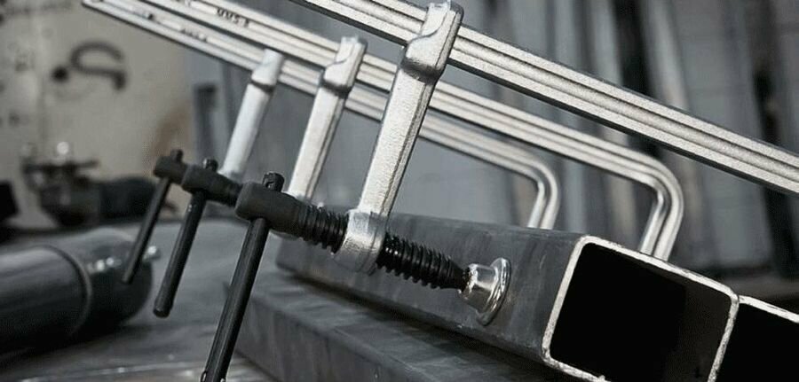 Слесарная F-образная цельнометаллическая струбцина с усилием зажима до 550 кгс. Неподвижная часть захвата образована отогнутым участком направляющего профиля и имеет отформованную площадку-упор. Профиль полнотелый из высоколегированной инструмент.стали сечением 22х11 мм. с долами для облегчения.