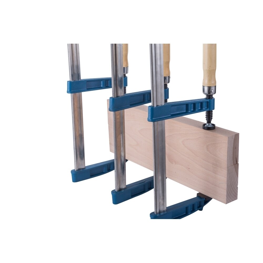 Универсальная F-образная струбцина для фиксации деталей при сборке и их сжатия при склеивании. Имеет прямую профилированную направляющую с насечками из прочной высоколегированной стали и кованные насадные упоры захвата. Винтовой прижим с износостойкой резьбой трапециевидного профиля.