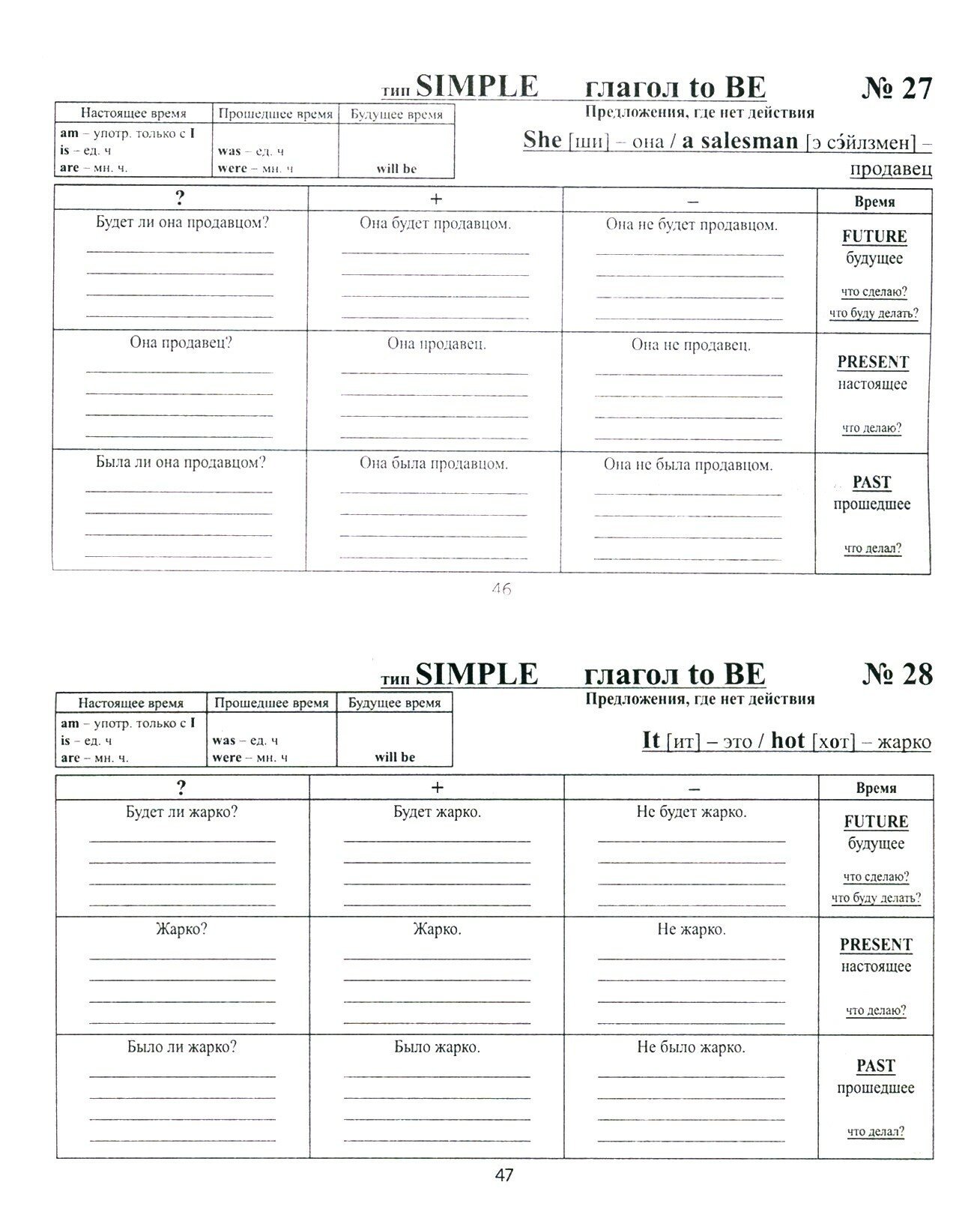 В начале книги представлен краткий грамматический справочник. Затем - 120 одинаковых таблиц, соответственно 120 предложений с глаголом to be. Тестирование состоит из двадцати двух предложений с глаголом to be. Предложения необходимо перевести на русский язык. В конце дан очень краткий англо-русский словарь.