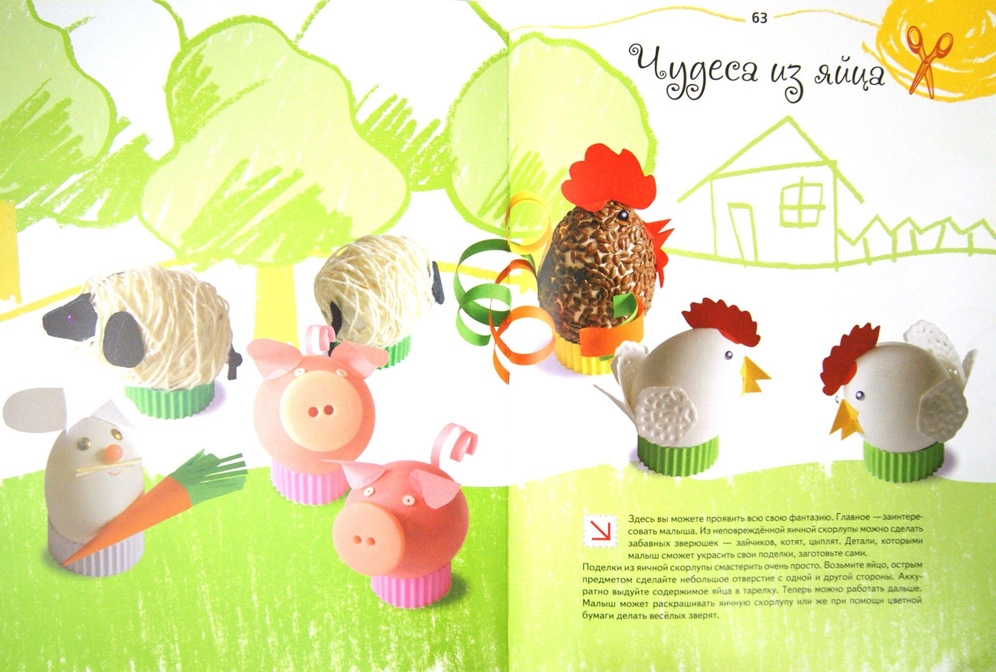 Красочная книга.В основном даны задания на поделки с различными зернами,но присутствуют картинки для рисования пальчиками,миниподелки из пустых яиц, печати из картофеля. В конце книги есть трафареты рисунков, по которым и выкладывают зернышки,либо разукрашивают пальчиками.