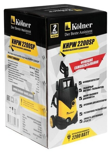 Аппарат высокого давления Kolner KHPW 2200 SP предназначена для мойки автомобилей и любой другой техники, террас, тротуарной и фасадной плитки, фасадов зданий, а также для прочистки дождевых сливов. Минимойка Kolner KHPW 2200 SP является самовсасывающей и может забирать воду из водопровода.