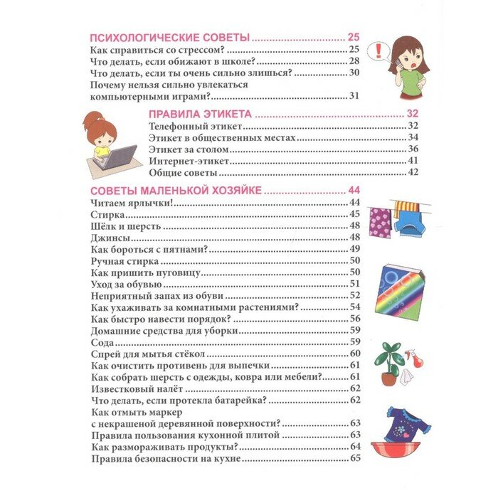 Книга понравилась, листы плотные гладкие, иллюстрации хорошие, понятные, формат книги небольшой, удобный. На 90 страницах рассказано от А до Я для жизни, развития, воспитания девочек. Всё про Уход за собой, Как правильно подбирать одежу, много всевозможных нехитрых Маленьких советов, Как ухаживать за волосами, где подробно с рисунками описаны простые прически, Психологические советы, Правила этикета, Советы маленькой хозяйке (очень много советов по уходу за вещами, советы на кухне и в быту), Простые рецепты (рецепты несложных блюд с картинками), Здоровый образ жизни (очень важно в наше время), Первая помощь (что делать, если...). Книжка просто находка, цена удивительная! Нам 1,5 года, но мы уже рассмотрели некоторые картинки)) Будем изучать, как станем постарше)