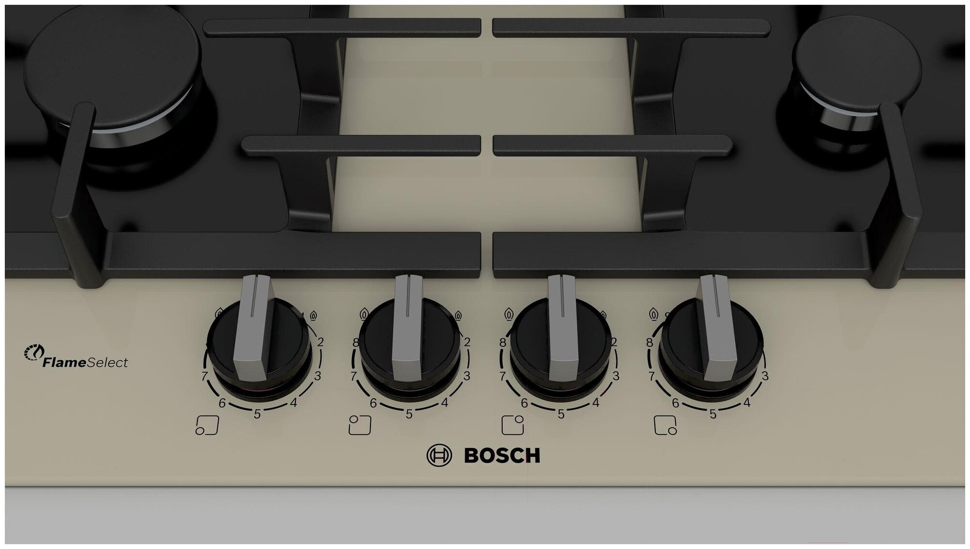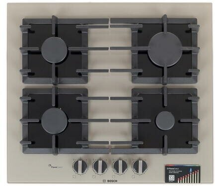 Bosch - независимая встраиваемая газовая панель изготовлена из закаленного стекла серого цвета, с чугунными решетками, с удобным расположением горелок, с автоматическим электроподжигом и газ-контролем.