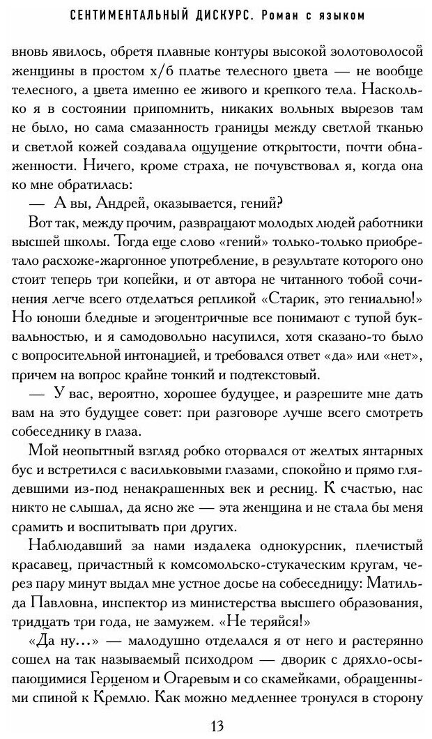 - "Сентиментальный дискурс" - производственный роман о герое-лингвисте, с вымышленной любовно-семейной фабулой, в котором много собственно лингвистического контента;
