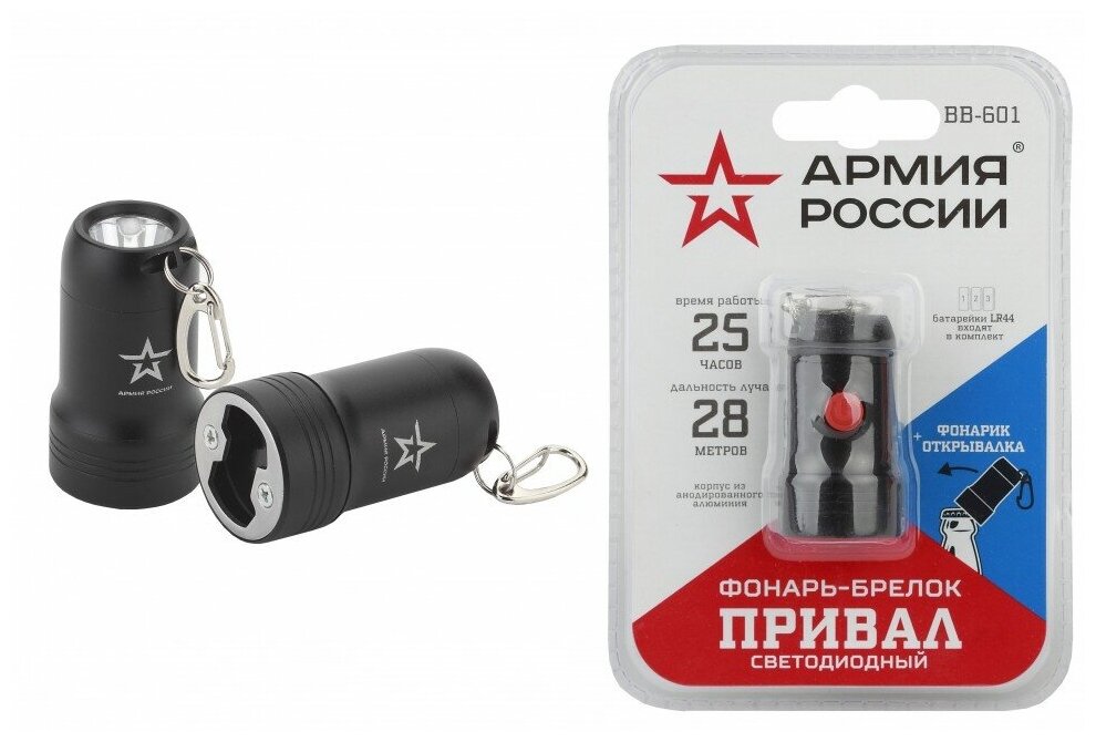 Туризм Эра Б0030181 ЭРА Армия России Привал ВВ-601 светодиодный фонарь-брелок + открывалка из анодированного алюминия. Сверхъяркий, суперэкономичный светодиод. Не требует обслуживания и замены на протяжении всего срока службы фонаря.