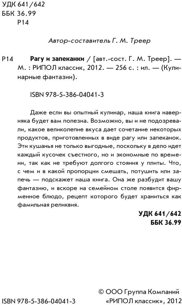Странно, что эту книгу так низко оценивали. Мне она понравилась и я с удовольствием рекомендую ее всем хозяюшкам. Рагу (исключая «ирландское») – это выручалочка на каждый день и отличный способ избавится от всего лишнего в холодильнике. А Запеканки помогают накормить детей овощами или приготовить вкусный домашний десерт. В этой книге полезных идей множество. Успешно их применяю и всем советую.