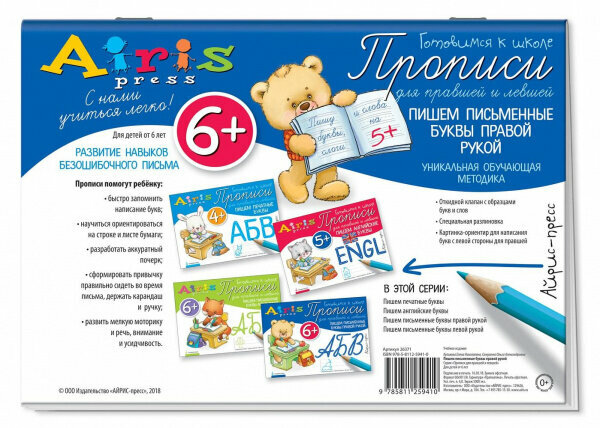 Особый раскладной клапан с образцами букв и слов удобно трансформируется. И во время письма ребёнок видит перед собой нужную информацию. А схема посадки при письме и подсказки, как лучше держать ручку, очень помогут ребёнку на первых занятиях. Взрослые оценят полезную информацию для организации занятий с правшой и левшой.