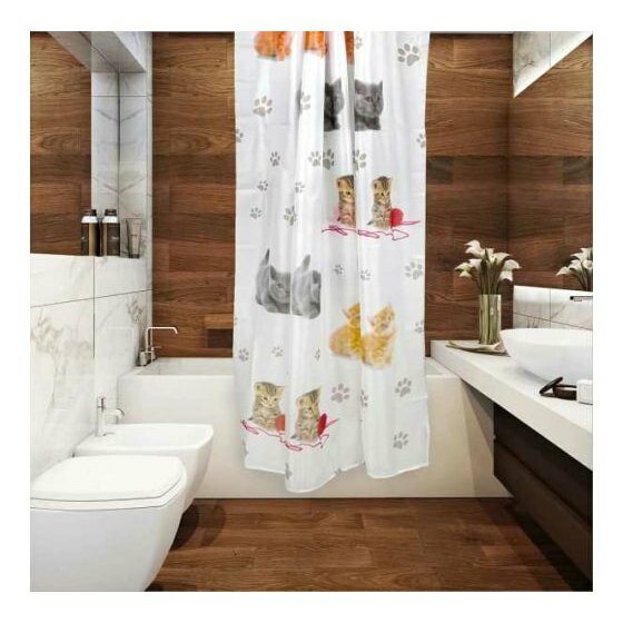 Занавеска для ванной комнаты с изображением разноцветных котят привнесет в общую атмосферу ванной комнаты игривое настроение и нотку комфорта. Штора отлично сочетается с моноколорными покрытиями светлых и темных оттенков. Органично гармонирует с предметами декора в той же цветовой гамме.