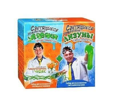 | Комплектация | активатор червяков, ёмкость для смешивания жидкостей, закрепитель слизи, защитные перчатки, мерная ложка, пипетка, полимерный раствор, светящийся порошок (фосфоресцент), цветная подробная инструкция |