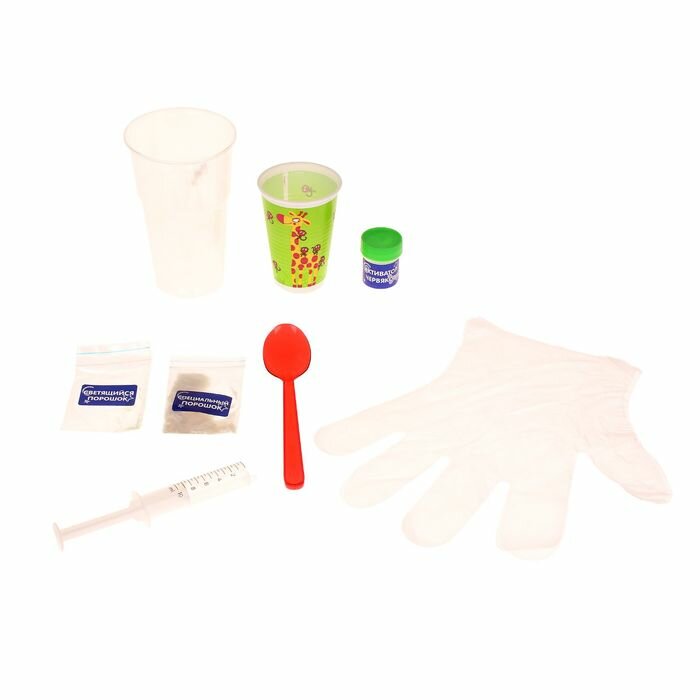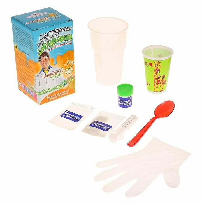 Комплектация | цветной полимерный раствор, активатор червяков, емкость для смешивания жидкостей, пипетка, светящийся порошок (фосфоресцент), мерная ложка, защитные перчатки. |