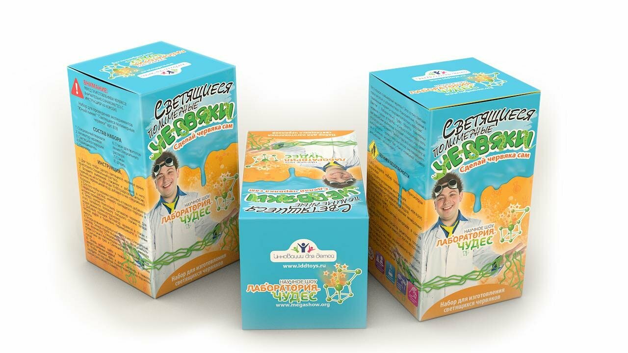 Как заинтересовать ребенка уроками химии? Ответ нашли в компании «Висма» (производитель кирпичиков БРИКМАСТЕР), запустив серию продукции «Юный химик». Например, набор «Светящиеся червяки» подходит для изучения свойств полимеров. В комплект входят реагенты, смешав которые, экспериментатор получит длинного червяка. Этот «червь» может светиться в темноте. Набор упакован в красочную картонную коробку.