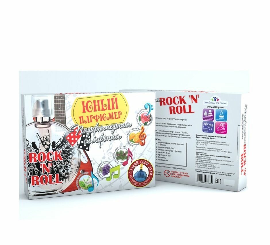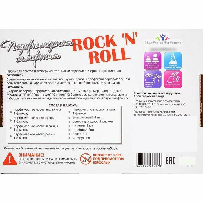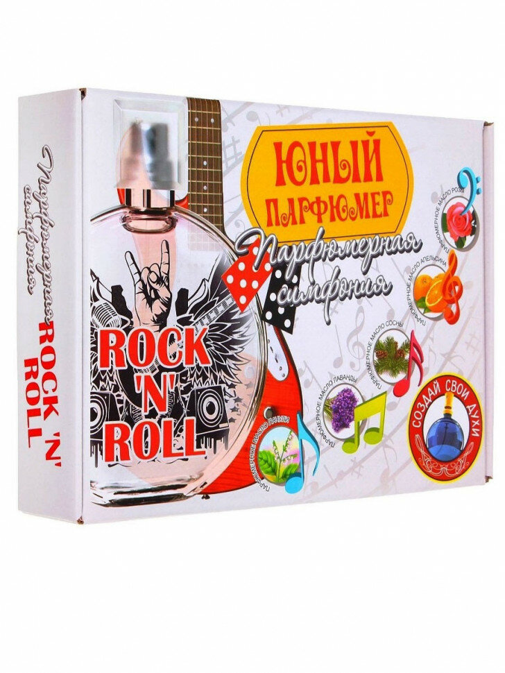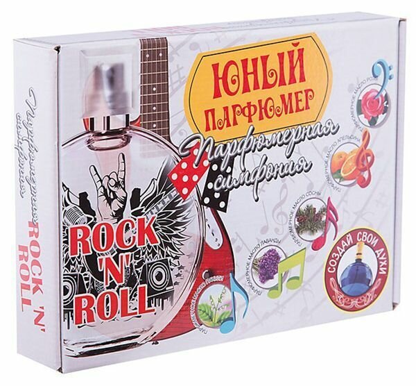 Набор Парфюмерная симфония предназначен для создания собственного аромата с использованием парфюмерных масел 5-ти растений: апельсина , сосны, лаванды, розы и пачули. Эти необычные ингредиенты придадут аромату особую индивидуальность. Смешивая масла между собой, ребенок сможет получить множество комбинаций и выбрать тот аромат, который придется ему по вкусу. В наборе можно найти все необходимое для создания собственного парфюма: основу для духов, пипетки, пробирки, флакон. Полученный аромат будет схож с мелодией в стиле Рок-н-ролл, его можно также послушать и получить множество приятных эмоций. Набор для создания духов Рок-н-ролл станет прекрасным подарком для юного парфюмера!