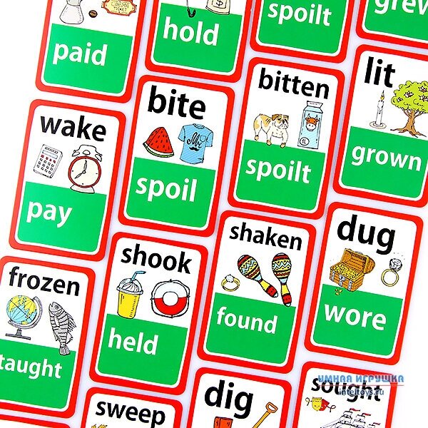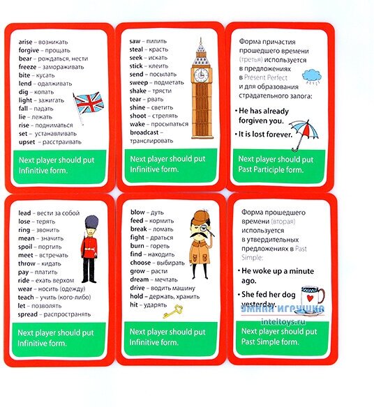 По началу, когда раскладывала первый раз по стопкам неправильные глаголы, испугалась, увидев 5 повторных карт. Думала другие не доложили. Но в итоге всё на месте (100 шт) + 5 лишних.