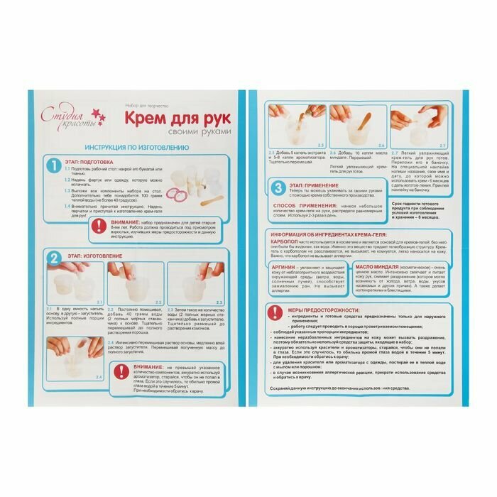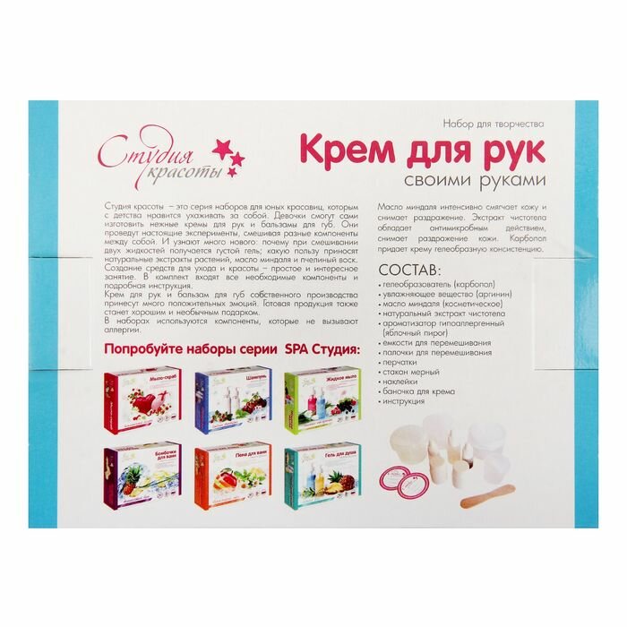 | Состав набора | ароматизатор - 1 шт; емкость для смешивания; палочки; перчатки; мерный стакан - 1 шт; наклейки; баночка - 1 шт; масло миндаля - 1 шт; натуральный экстракт - 1 шт; гелеобразователь - 1 шт; аргинин - 1 шт |