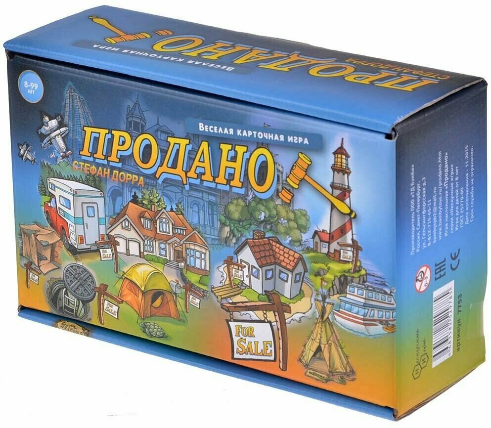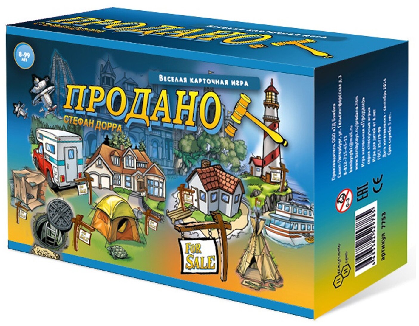 Продано - семейная игра про торговцев недвижимостью на аукционе. Суть игры: вначале игры игроки продают дома по наиболее выгодной цене, а потом покупают. В основе игры - идея двойного аукциона. Игра Продано! - это две колоды по 30 карт разного достоинства и около 70 жетонов монет. Состав игры: 30 карт недвижимости с номерами от 1 до 30, 30 карт валюты разного номинала, 60 монет по 1000 долларов, 12 монет по 2000 долларов, иллюстрированная инструкция на русском языке.