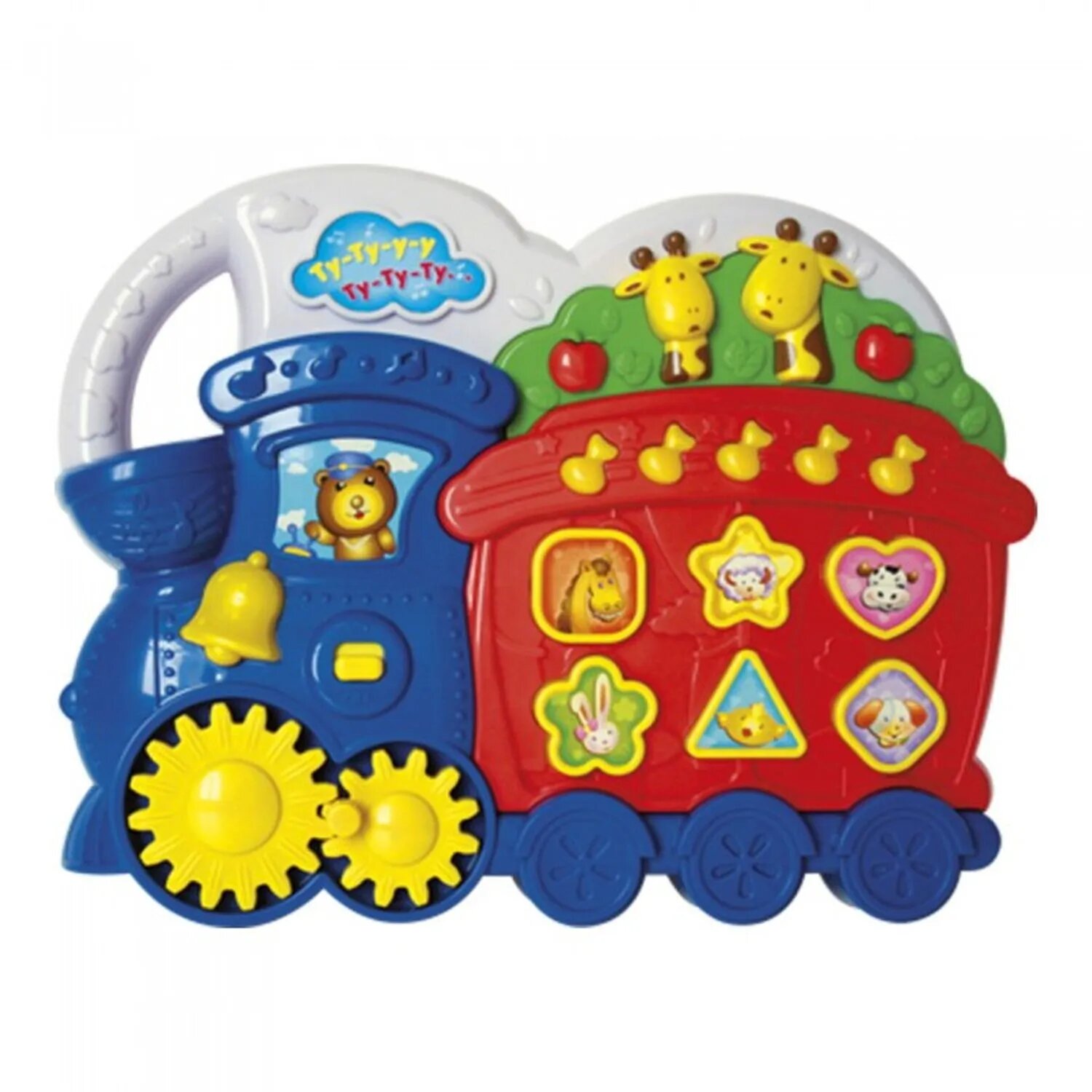 Игрушка имеет несколько игровых режимов, которые переключаются кнопками-жирафами. При нажатии кнопок-яблок игра «свистит» или «гудит», как паровоз. Нажимая на клавиши с изображением животных, ребенок сможет услышать веселую мелодию и подпевающих под музыку животных. Во время проигрывания мелодий светится колокольчик в такт музыке. Ребенок может крутить колесики, чтобы паровоз «ехал». Нажимая на кнопки-нотки, ребенок сможет проигрывать разные мелодии.