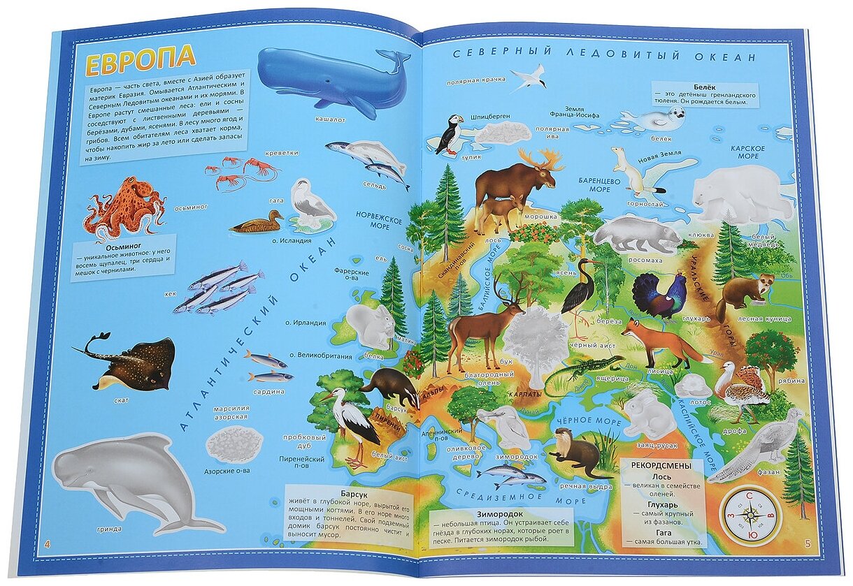 Благодаря этому атласу с наклейками Ваш малыш в доступной игровой форме узнает, какое разнообразие животных и растений обитает на нашей планете. Используя картинки-наклейки, ребёнок познакомится с представителями флоры и фауны Евразии, Африки, Северной и Южной Америки, Антарктиды, Австралии, а также с обитателями морей и океанов. Кроссворд поможет закрепить полученные знания о животных нашей планеты.