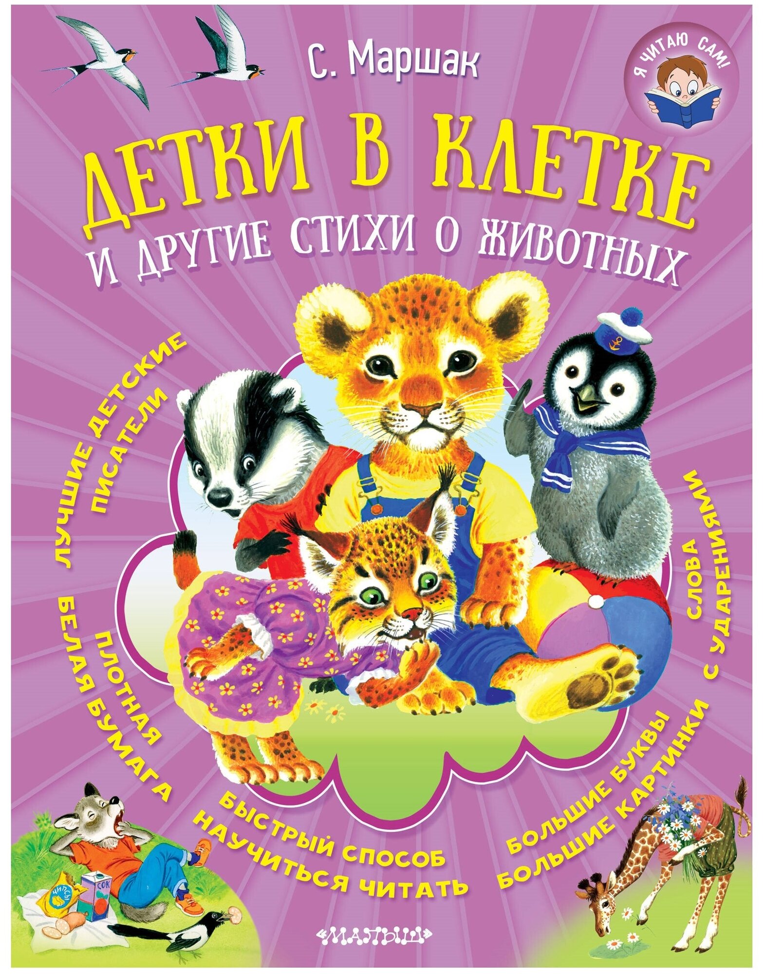Детки в клетке и другие стихи о животных. Маршак С. Я. Я читаю сам!В книгу "Детки в клетке и другие стихи о животных" вошли самые знаменитые стихотворения про зверей и птиц, которые написал классик детской литературы С. Маршак.Дети познакомятся со многими животными, узнают, как они живут и как выглядят, а самое главное, смогут сами прочитать всю книжку от начала и до конца.Ведь в этом сборнике большие буквы и слова с ударениями. Это отличная практика чтения.Для дошкольного возраста.Содержание:Детки в клеткеДва котаПудельУрок вежливостиУсатый-полосатыйЦирк Дурова