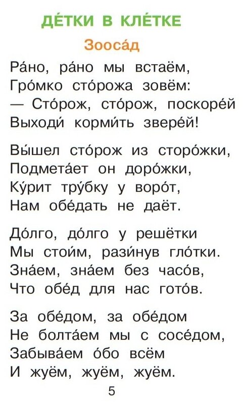 Очень крупный шрифт, красочные иллюстрации, плотная бумага, твердый переплет. Проставлены ударения. Нравится, что картинок достаточно много. Начинающему читать ребенку удобнее читать стихи, чем прозу. Так на странице меньше текста, а, значит, глаза меньше устают. Стихи о животных - это тоже привлекательно для малышей. Книга очень понравилась! Но лично для меня минус - дублирование произведений "Пудель" (из книги этой же серии с оранжевой обложкой) и "Урок вежливости (из книги с фиолетовой обложкой, где про мышонка). Поэтому если человек купил почти всю серию, в этой книге он теряет около двадцати страниц. Иллюстрации в книге красивые, но две в конце книге выполнены в другом стиле, в них есть сходство с детским рисунком и темные краски. Для дошкольников книга подойдет идеально - шрифт, обилие иллюстраций, простой текст.