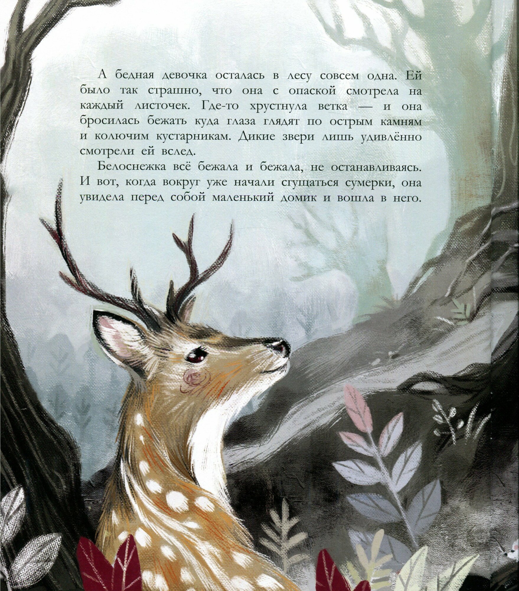 Перевод Н.Терентьевой понравился, читается легко, к тому же отсутствуют некоторые не особо приятные моменты (например, в других переводах мачеха велела егерю не просто отвести в лес Белоснежку и убить, но и принести в знак доказательства её лёгкие и печень. Пожалевший Белоснежку егерь принёс злой королеве лёгкие и печень оленя, та велела их сварить и затем съела, думая, что это лёгкие и печень Белоснежки. А в конце сказки мачеха была сама не менее жестоко наказана – её заставили надеть железные раскалённые туфли и плясать в них, пока она не упала мёртвая). В данном издании этих ужасов нет, перевод подходит и для самых маленьких читателей.