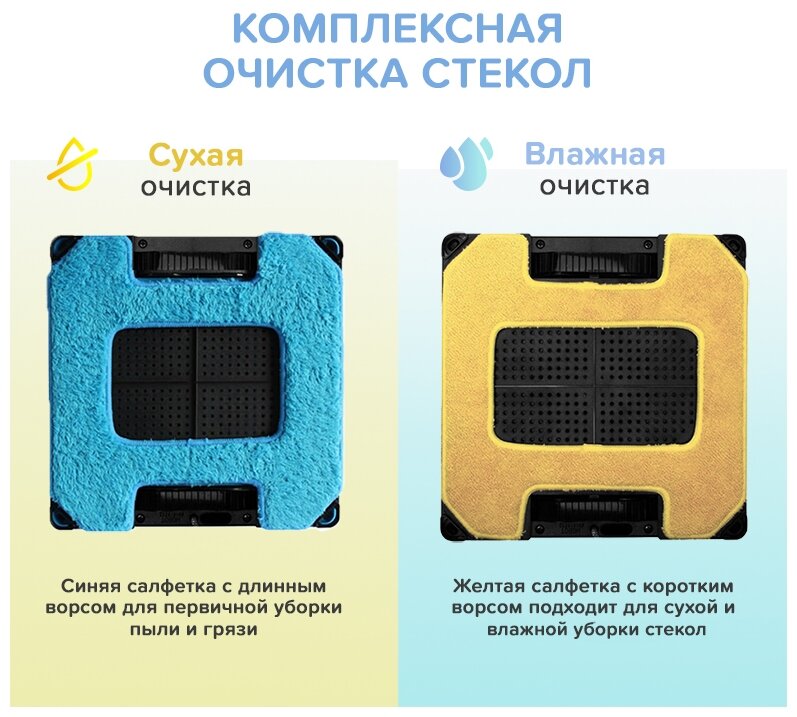 повторяет движения человека, моющего окно. Особенно эффективен при уборке высоких окон и наружных стёкол, потому что он возвращается на то место, откуда начал работу. Робот надёжно удерживается на вертикальной поверхности и даже на потолке с помощью вакуумного насоса. Мягкие салфетки для сухой и влажной уборки из микрофибры не повреждают поверхность. Их можно многократно стирать.