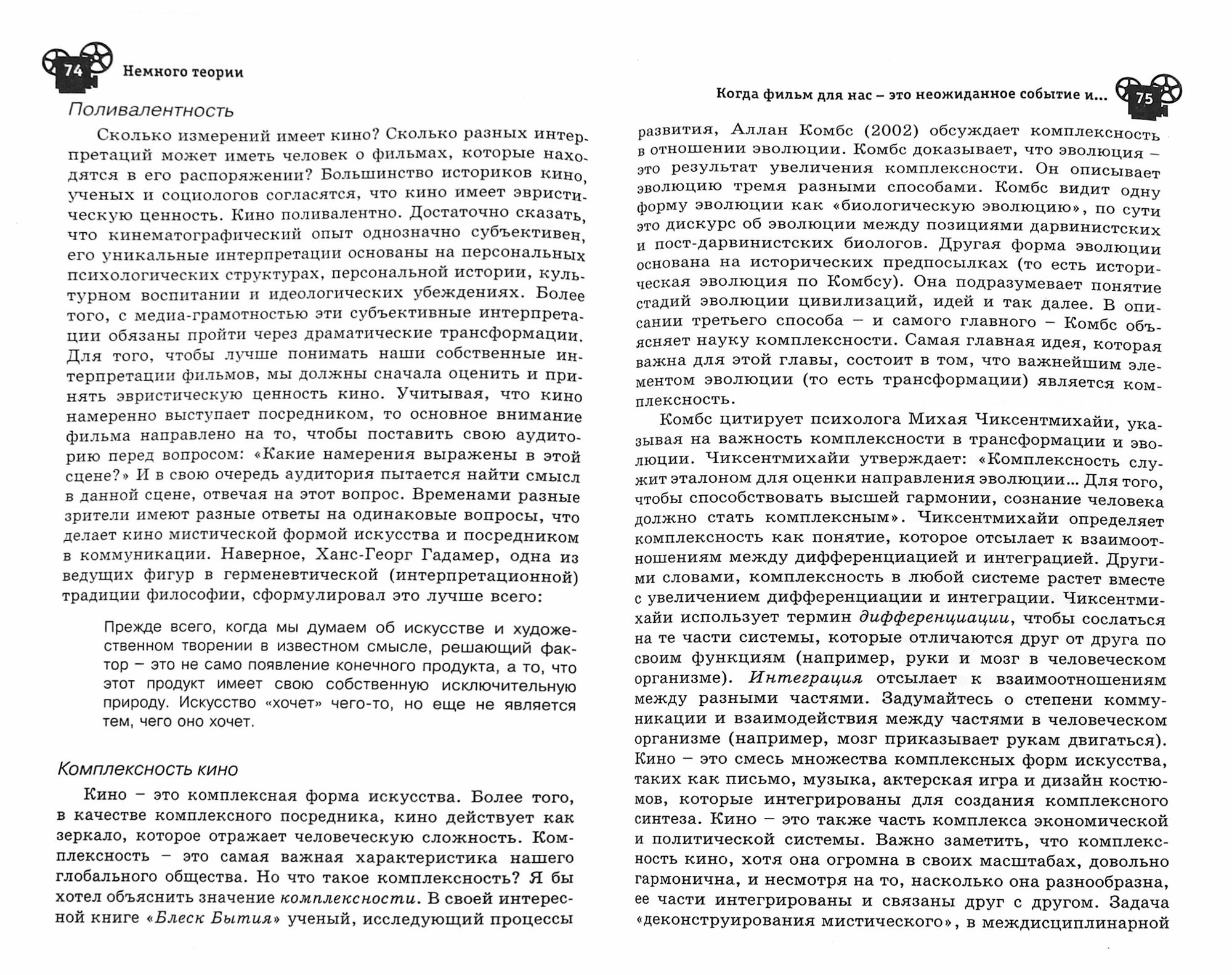 Основной вопрос данной книги: как кино может влиять на личностный рост человека, на социальные группы. Как и многие современные западные авторы, Кашани выбирает довольно свободный стиль изложения. Не забывает и про ссылки. Какая радость, что издатели ими не пренебрегли. Их в этой работе более 160.