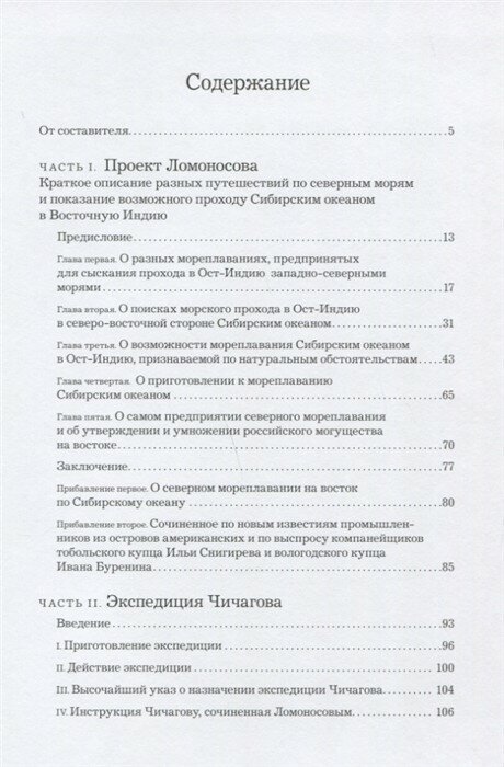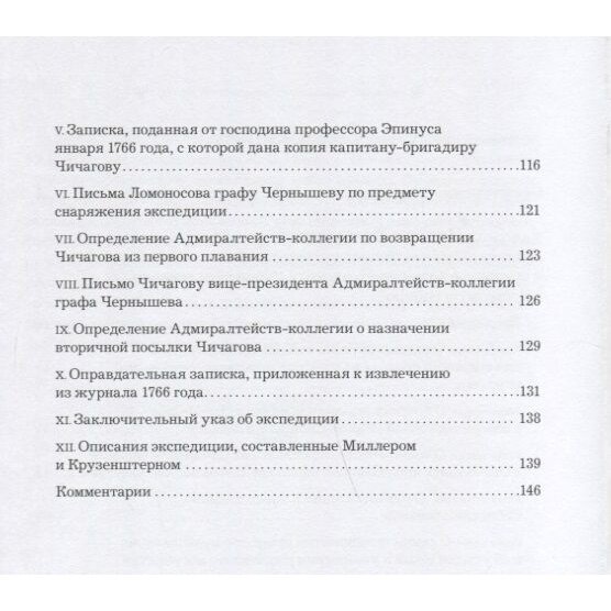 Кроме того, в книгу вошли материалы о подготовке экспедиции, инструкции ее руководителю, капитану бригадирского ранга Чичагову, оправдательная записка Чичагова, объясняющая причины неуспеха экспедиции, документы Адмиралтейской коллегии и письма, связанные с отправкой обоих плаваний Чичагова, а также описание его путешествий.