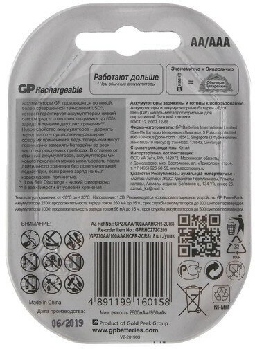 | Описание | Перезаряжаемые аккумуляторы GP емкость 2700 мАч - 4шт + 1000 мАч - 4шт. 270AA/100AAAHCFR-2CR8 многоразового использования оптимально подходят для радиотелефонов, фототехники, различных переносных аудиоустройств, осветительных приборов и инструментов.,,К комплекту прилагаются 4 аккумулятора типа ААА - 100AAAHC. Приобретая такой набор, вы получаете аккумуляторы двух самых распространенных типоразмеров (АА/ААА) с максимальными емкостными характеристиками.,,Благодаря технологии LSD (Low Self Discharge) все элементы питания имеют низкий уровень саморазряда в процессе их хранения. Высокая плотность и 500 циклов перезаряда, позволит вам сэкономить значительные средства на использовании аккумуляторов вместо одноразовых батареек.,,Экологичность – один из приоритетов компании GP, поэтому состав аккумуляторов не имеет вредных компонентов, таких как кадмий, ртуть и прочие тяжелые металлы. Производитель заботится об окружающей среде в процессе утилизации использованных аккумуляторов. |