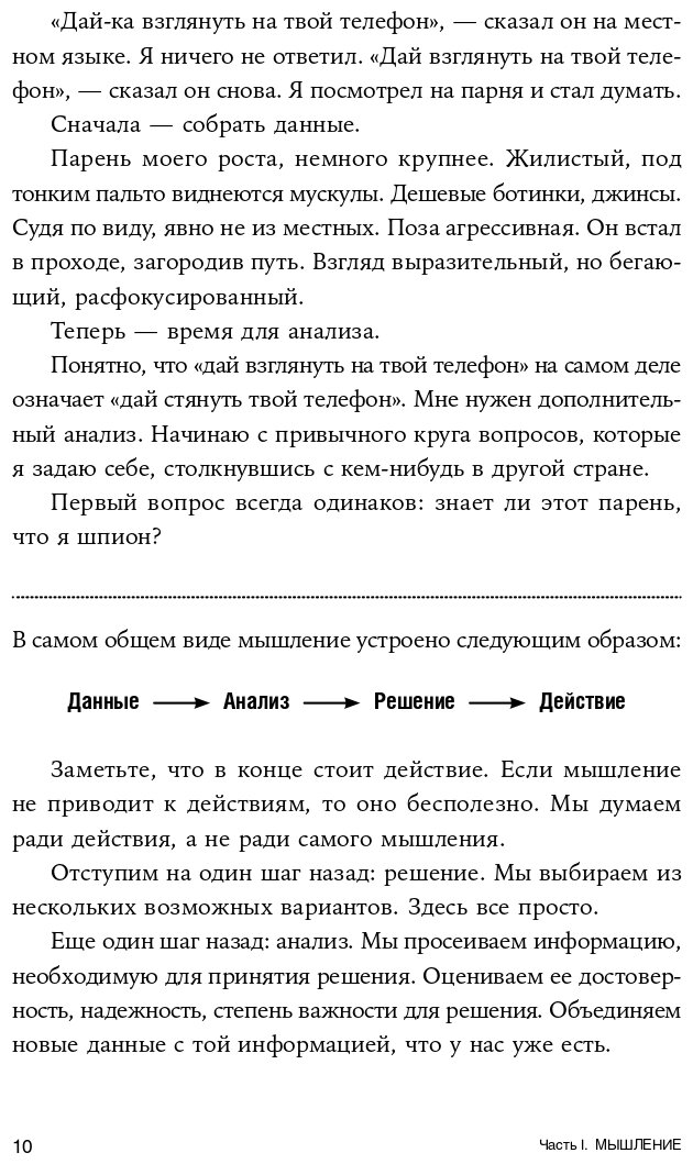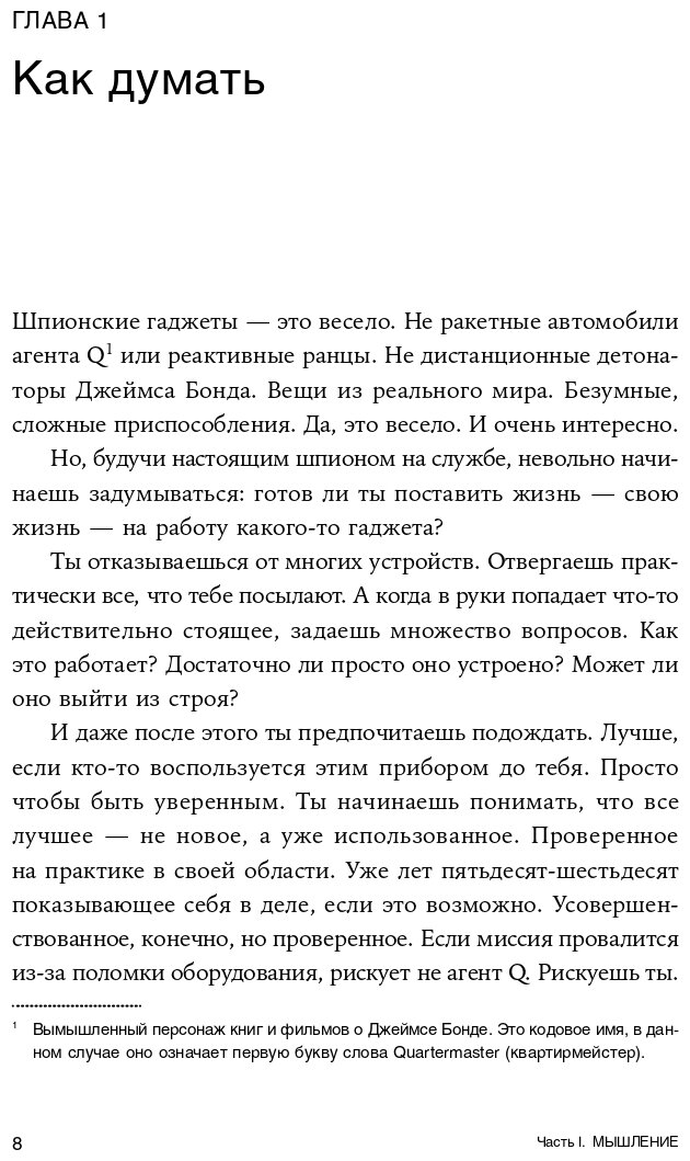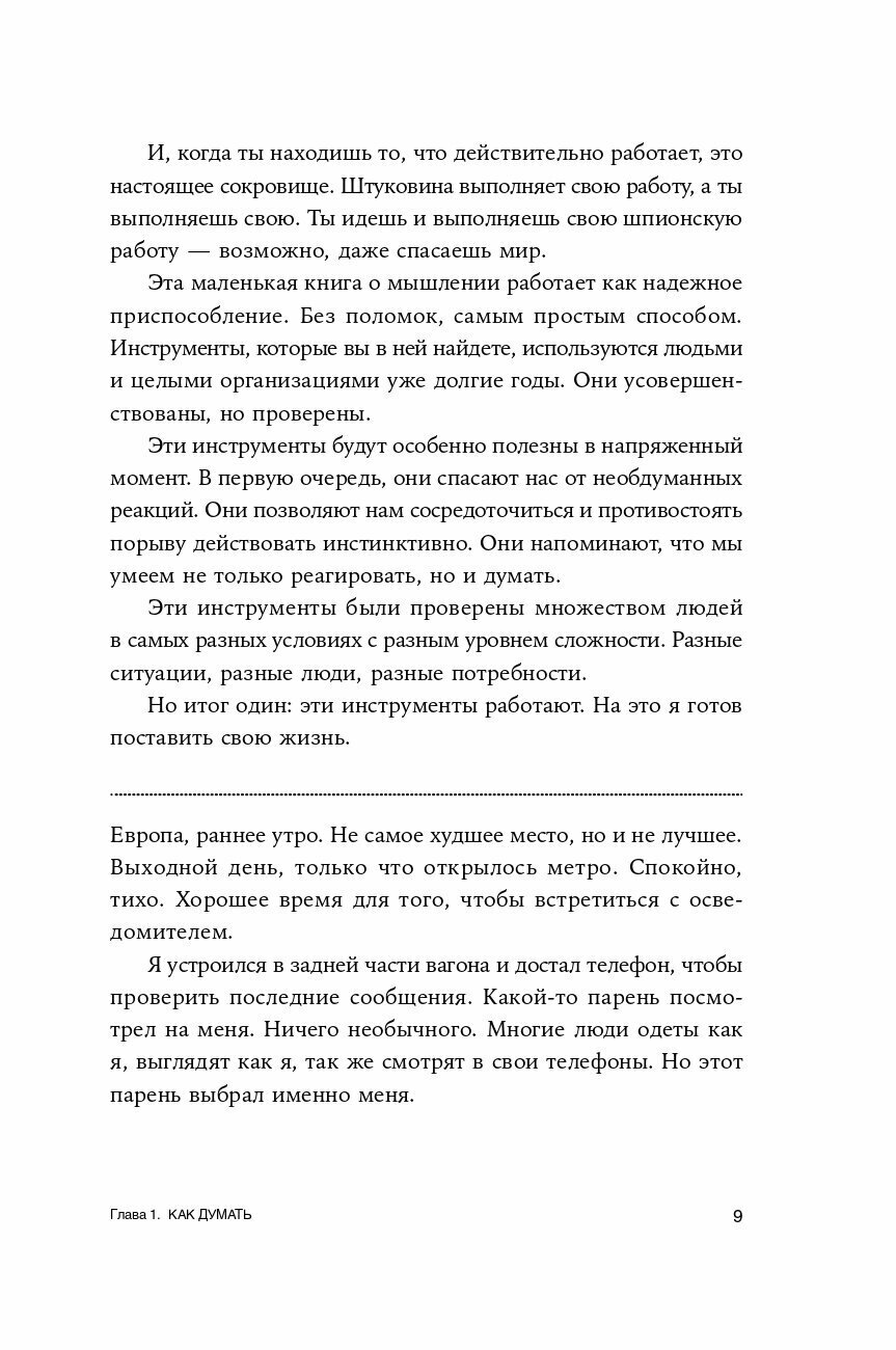 Шпионаж — это не хитроумные девайсы в духе Бонда, а особый способ мышления, оценки обстановки и выработки правильного решения в максимально сжатые сроки. В своей книге Бреддок рассказывает об инструментах мышления, благодаря которым он успешно справлялся со своей работой и смог выжить во многих опасных ситуациях. Эти инструменты просты, но эффективны. Вы узнаете, как сосредоточиться и противостоять порыву действовать инстинктивно, и научитесь думать перед тем, как реагировать, что бы ни происходило вокруг.