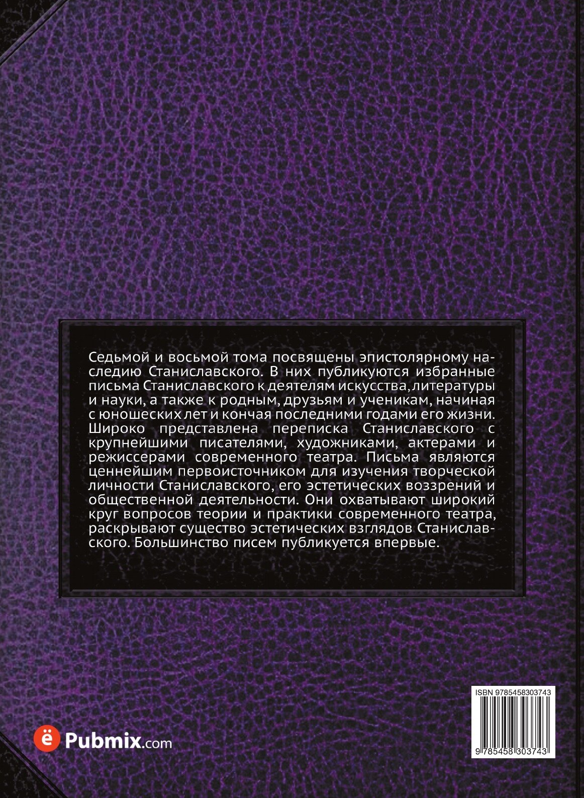 Седьмой и восьмой тома посвящены эпистолярному наследию Станиславского. В них публикуются избранные письма Станиславского к деятелям искусства, литературы и науки, а также к родным, друзьям и ученикам, начиная с юношеских лет и кончая последними годами его жизни. Широко представлена переписка Станиславского с крупнейшими писателями, художниками, актерами и режиссерами современного театра. Письма являются ценнейшим первоисточником для изучения творческой личности Станиславского, его эстетических воззрений и общественной деятельности. Они охватывают широкий круг вопросов теории и практики современного театра, раскрывают существо эстетических взглядов Станиславского. Большинство писем публикуется впервые.