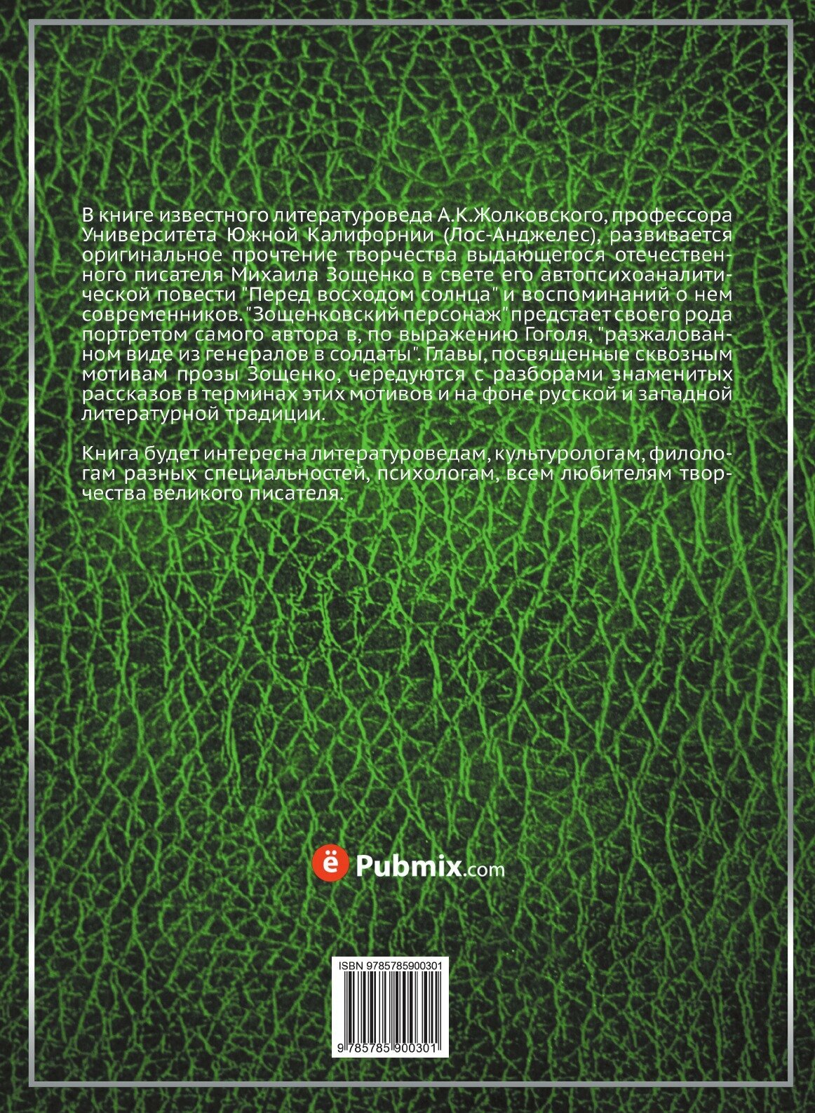 В книге известного литературоведа А.К.Жолковского, профессора Университета Южной Калифорнии (Лос-Анджелес), развивается оригинальное прочтение творчества выдающегося отечественного писателя Михаила Зощенко в свете его автопсихоаналитической повести "Перед восходом солнца" и воспоминаний о нем современников. "Зощенковский персонаж" предстает своего рода портретом самого автора в, по выражению Гоголя, "разжалованном виде из генералов в солдаты". Главы, посвященные сквозным мотивам прозы Зощенко, чередуются с разборами знаменитых рассказов в терминах этих мотивов и на фоне русской и западной литературной традиции. Книга будет интересна литературоведам, культурологам, филологам разных специальностей, психологам, всем любителям творчества великого писателя.