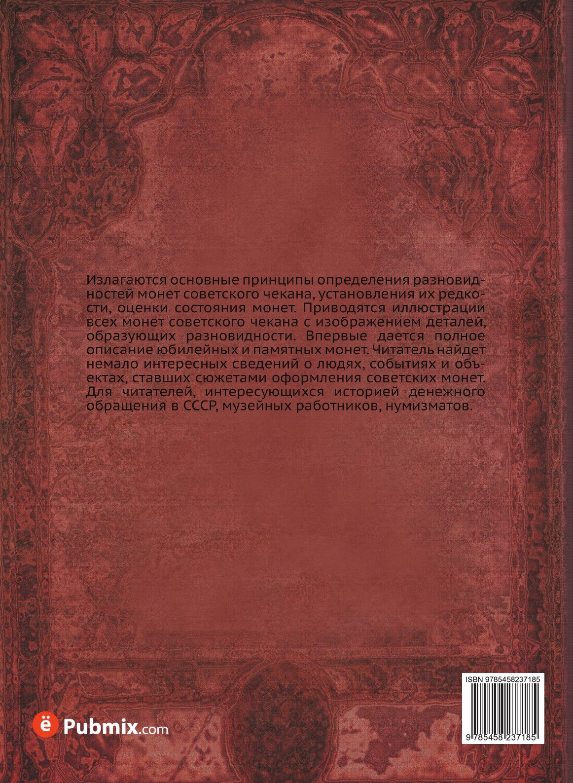 Излагаются основные принципы определения разновидностей монет советского чекана, установления их редкости, оценки состояния монет. Приводятся иллюстрации всех монет советского чекана с изображением деталей, образующих разновидности. Впервые дается полное описание юбилейных и памятных монет. Читатель найдет немало интересных сведений о людях, событиях и объектах, ставших сюжетами оформления советских монет. Для читателей, интересующихся историей денежного обращения в СССР, музейных работников, нумизматов.