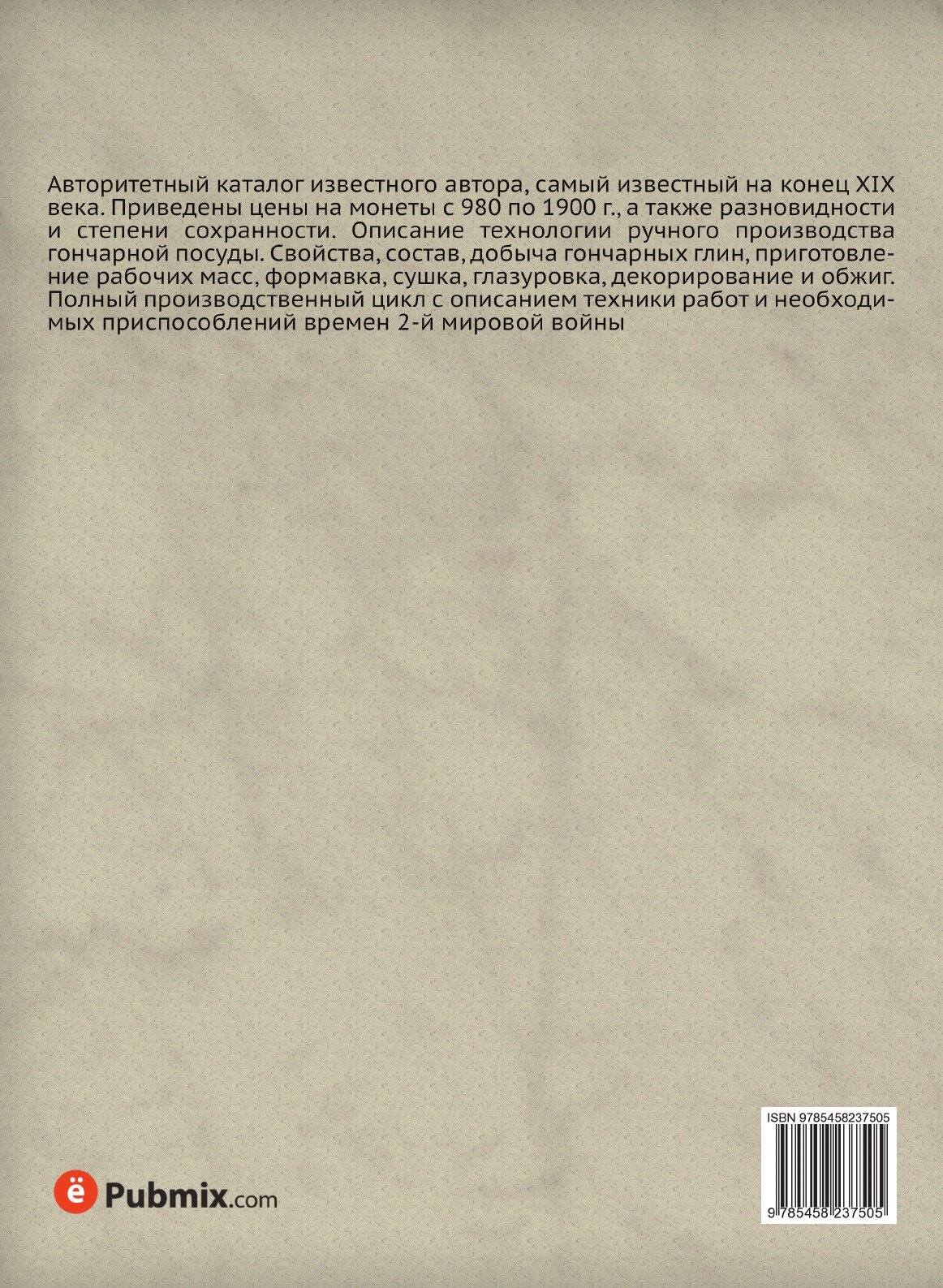 Авторитетный каталог известного автора, самый известный на конец XIX века. Приведены цены на монеты с 980 по 1900 г., а также разновидности и стпени сохранности. Описание технологии ручного производства гончарной посуды. Свойства, состав, добыча гончарных глин, приготовление рабочих масс ,формавка, сушка, глазуровка, декорирование и обжиг. Полный производственный цикл с описанием техники работ и необходимых приспособлений времен 2-й мировой войны