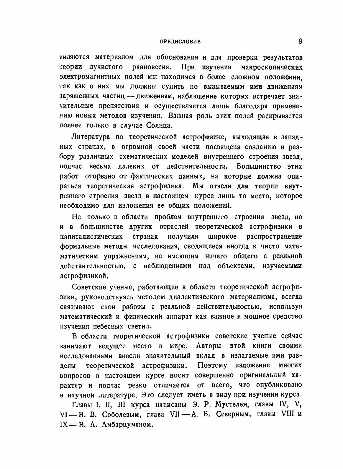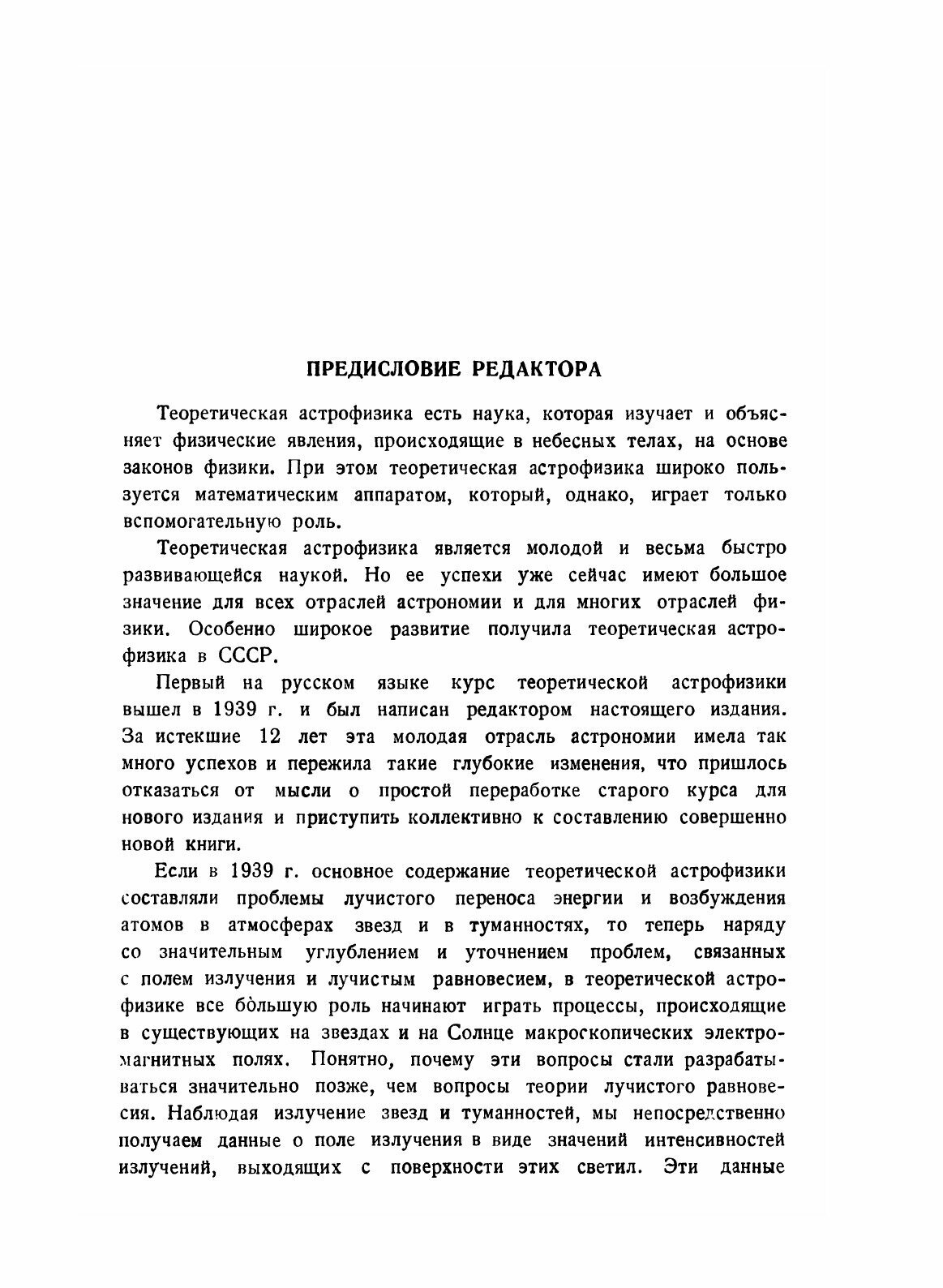 Теоретическая астрофизика есть наука, которая изучает и объясняет физические явления, происходящие в небесных телах, на основе законов физики. При этом теоретическая астрофизика широко пользуется математическим аппаратом, который, однако, играет только вспомогательную роль.Теоретическая астрофизика является молодой и весьма быстро развивающейся наукой. Но ее успехи уже сейчас имеют большое значение для всех отраслей астрономии и для многих отраслей физики. Особенно широкое развитие получила теоретическая астрофизика в СССР.Первый на русском языке курс теоретической астрофизики вышел в 1939 г. и был написан редактором настоящего издания. За истекшие 12 лет эта молодая отрасль астрономии имела так много успехов и пережила такие глубокие изменения, что пришлось отказаться от мысли о простой переработке старого курса для нового издания и приступить коллективно к составлению совершенно новой книги.