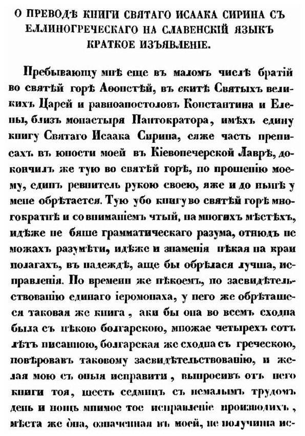 Преподобный Исаак Сирин писал главным образом для монашествующих. Основная тема его духовных сочинений - конечная цель аскетических подвигов: молитвенное созерцание Бога и обожение человека. Без сомнения преподобный Исаак Сирин является одним из величаших аскетических писателей всех времен. Характерная особенность творений преподобного Паисия - благоговейная точность перевода. Значение трудов преподобного Паисия высоко оценивал его великий последователь святитель Игнатий(Брянчанинов). В ответном письме преподобному Макарию Оптинскому он писал: "Я совершенно согласен с Вами, что для монашества, которое жительствует по книгам святых отцов, необходим точный перевод с подлинников посредством лица, вполне знающего монашескую жизнь. Таковым лицом, без сомнения, был Старец Паисий. Русские же переводы не имеют этого достоиства. "