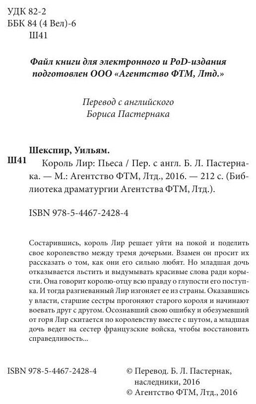 На сегодняшний день товар «Книга: Король Лир (Уильям Шекспир); ФТМ, 1608» можно купить с кешбеком в 1 магазине: ЛитРес