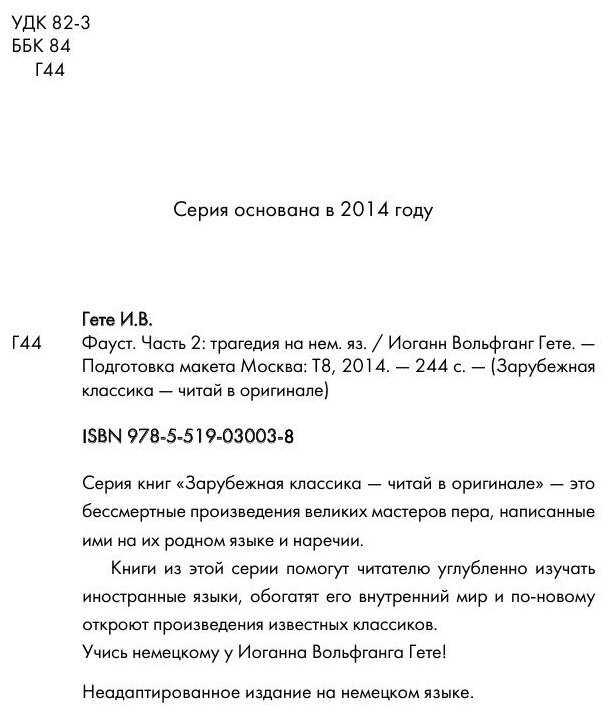 Трагедия Иоганна Гете «Фауст» часть 2 на немецком языке, входит в серию книг «Зарубежная классика — читай в оригинале». Эта коллекция собрана из бессмертных произведений великих мастеров пера, написанных ими на их родном языке. Книги из этой серии помогут читателю углублённо изучать иностранные языки, обогатят его внутренний мир и по-новому откроют произведения известных классиков. Учись немецкому у Иоганна Гете! пьеса: трагедия.