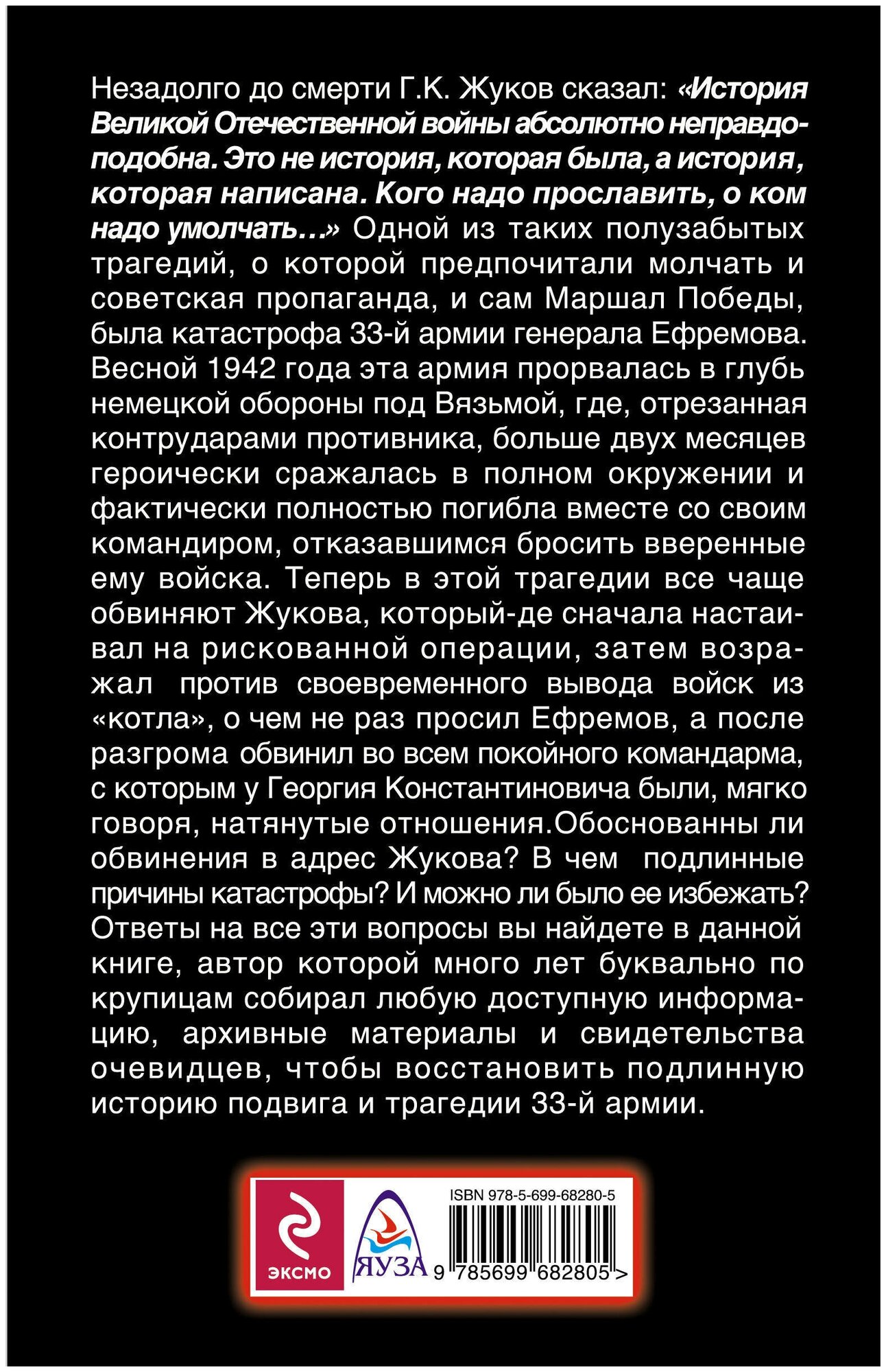 Незадолго до смерти Г.К. Жуков сказал: "История Великой Отечественной войны абсолютно неправдоподобна. Это не история, которая была, а история, которая написана. Кого надо прославить, о ком надо умолчать..." Одной из таких полузабытых трагедий, о которой предпочитали молчать и советская пропаганда, и сам Маршал Победы, была катастрофа 33-й армии генерала Ефремова. Весной 1942 года эта армия прорвалась в глубь немецкой обороны под Вязьмой, где, отрезанная контрударами противника, больше двух месяцев героически сражалась в полном окружении и фактически полностью погибла вместе со своим командиром, отказавшимся бросить вверенные ему войска. Теперь в этой трагедии все чаше обвиняют Жукова, который-де сначала настаивал на рискованной операции, затем возражал против своевременного вывода войск из "котла", о чем не раз просил Ефремов, а после разгрома обвинил во всем покойного командарма, с которым у Георгия Константиновича были, мягко говоря, натянутые отношения.