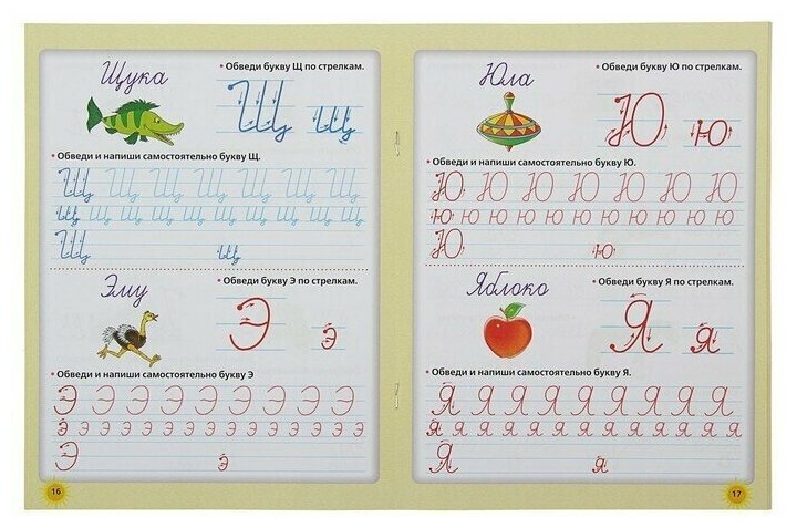 Довольно удачная пропись для начинающих. Большой формат, плотная бумага, цветные иллюстрации. Обозначены направление движения и точка старта. Ребенку нравится обводить именно целые буквы (не клеточки, не крючочки), есть место для самостоятельного написания. Буквы и цифры в одной тетради. Есть небольшие задания в конце, в т.ч. на счет.