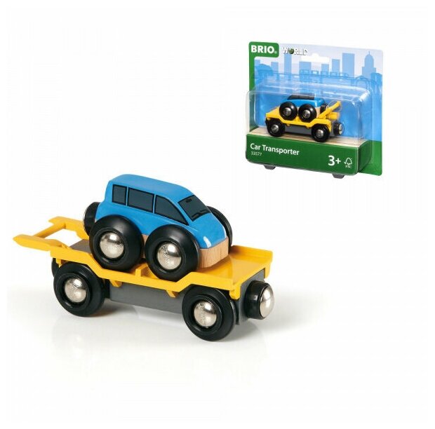 Элемент для построения железной дороги. Эвакуатор-перевозчик автомобилей прикрепляется к любому паровозику с помощью магнита. Машинка входит в комплект, и ей можно также играть отдельно. Платформа на перевозчике поднимается и опускается, чтобы с удобством погрузить автомобиль на него. Для более реалистичной игры можно составить длинный поезд, перевозящий автомобили!