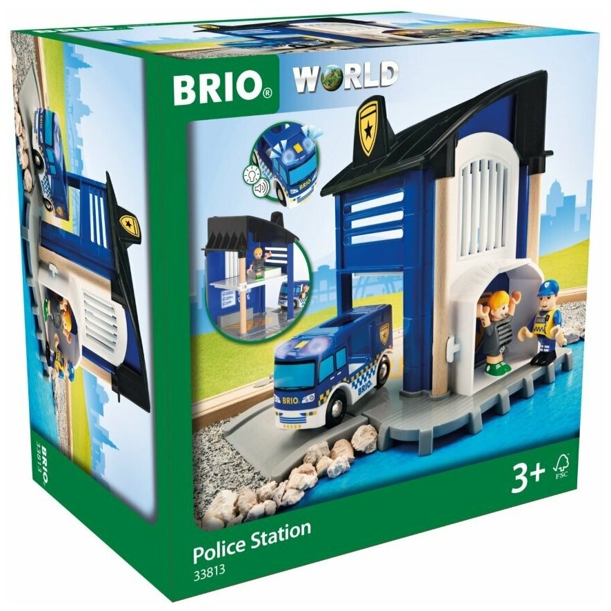 Игровой набор для деревянной железной дороги Полицейский участок от бренда Brio состоит из 6 крупных деталей, машинки и фигурок человечков. Из деталей ребенку нужно собрать оборудованный полицейский участок, к которому подведены автодорога и железнодорожные пути. Полицейская машинка оснащена световым и звуковым эффектами, что делает игру особенно реалистичной. На второй этаж участка человечки могут подняться на лифте. Данный набор подходит к любой железной дороге от марки Brio.