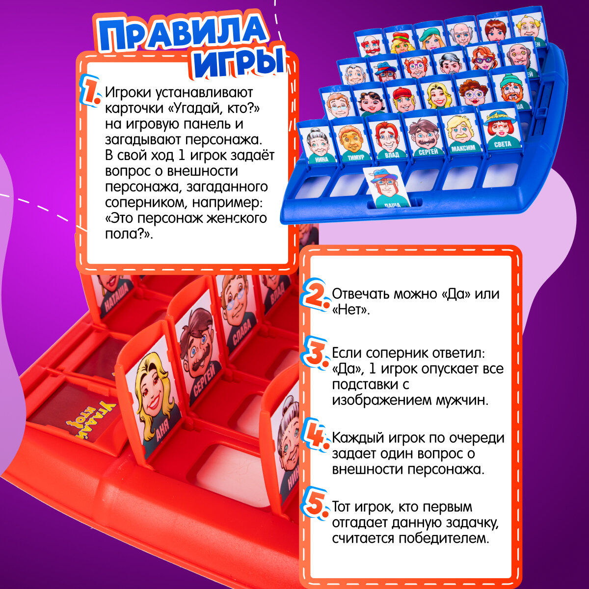 | Описание | Игроки садятся друг напротив друга. Каждый игрок берёт себе игровую панель и кладёт её перед собой, закрепляя индивидуальные подставки для карточек персонажей в вертикальном положении. Игроки вставляют карточки «Угадай кто?» во все свободные индивидуальные ячейки. Каждый игрок выбирает персонажа, которого будет отгадывать другой игрок, и ставит эту карточку в отдельную ячейку. В свой ход каждый игрок может задавать один вопрос о внешности персонажа, которого загадал противник. Ответ должен быть либо “Да”, либо “Нет”. Другой игрок должен отвечать на вопрос честно, после чего игрок, задавший вопрос, может опустить на своей панели карточки, на которых персонажи не подходят под описание заданного вопроса. |