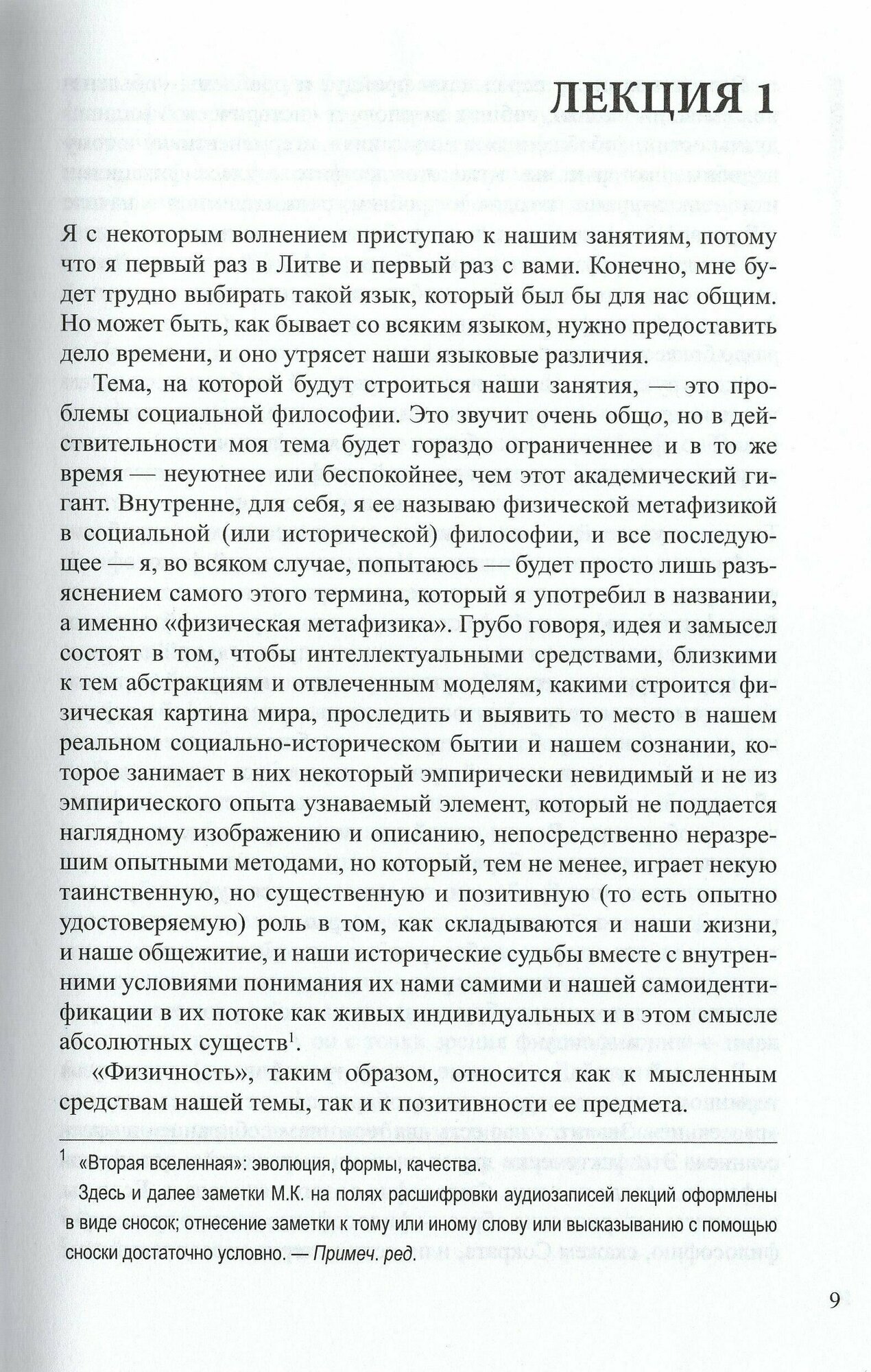 В книге представлен курс лекций по социальной философии, прочитанных Мерабом Мамардашвили в Вильнюсе в 1981 году. Философ излагает свое понимание социальности, прослеживает сложные взаимосвязи между устройством общества, его функционированием и мышлением. Ни в одном другом своем тексте автор не утверждает столь прямо и последовательно зависимость мышления от включенности в отношения с другими людьми, от того, что он называет "сообщностью" и "событием". Речь идет не столько о самом социальном порядке, сколько о том, что является вытесняемым, невидимым условием этого порядка: об общности, которая, по сути, этот порядок разрывает, о силах совместного существования людей, силах жизни. Книга предлагает заново обдумать проблемы свободы, ответственности, этического и политического действия.